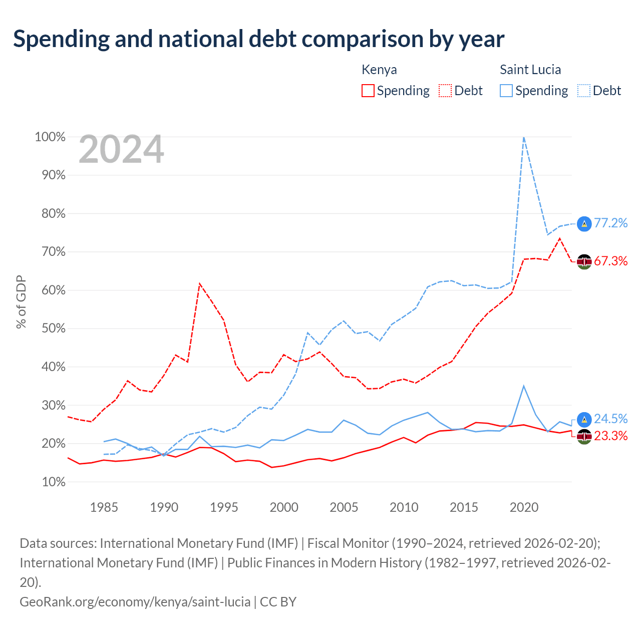 Kenya has $81B in government debt (67.3% of GDP), compared to $1.97B (77.2% of GDP) in Saint Lucia.