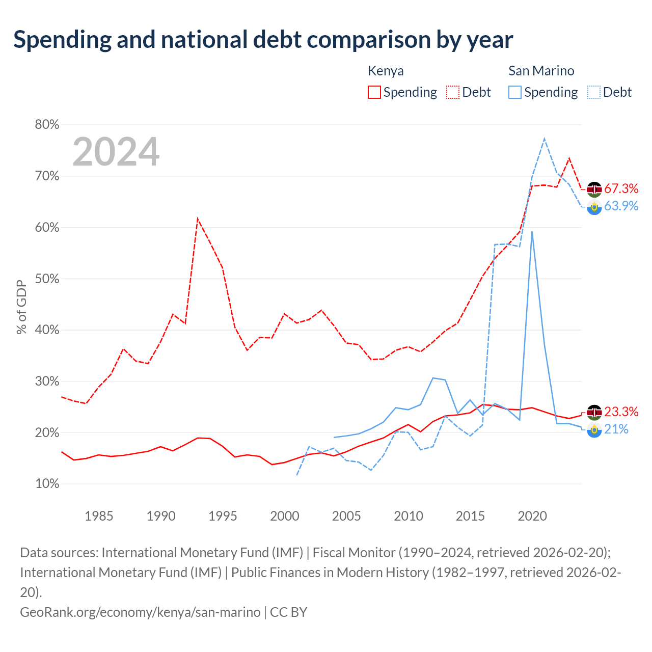 Kenya has $81B in government debt (67.3% of GDP), compared to $1.39B (63.9% of GDP) in San Marino.