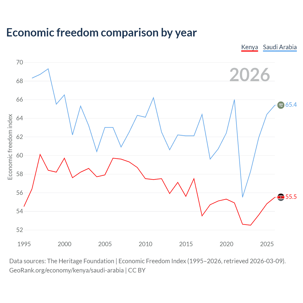 The Economic Freedom Index for Kenya is 55.5, ranking 128/197, compared to 65.4 for Saudi Arabia, ranking 65/197. The chart above displays a comparison of annual changes in economic freedom indexes.