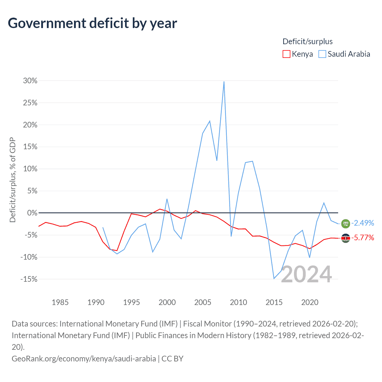 Kenya has a GDP of $120B compared to $1.24T for Saudi Arabia, ranking 64/197 and 18/197 by economy size, respectively.
