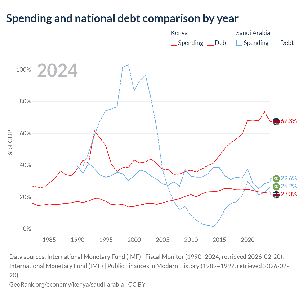 Kenya has $81B in government debt (67.3% of GDP), compared to $324B (26.2% of GDP) in Saudi Arabia.