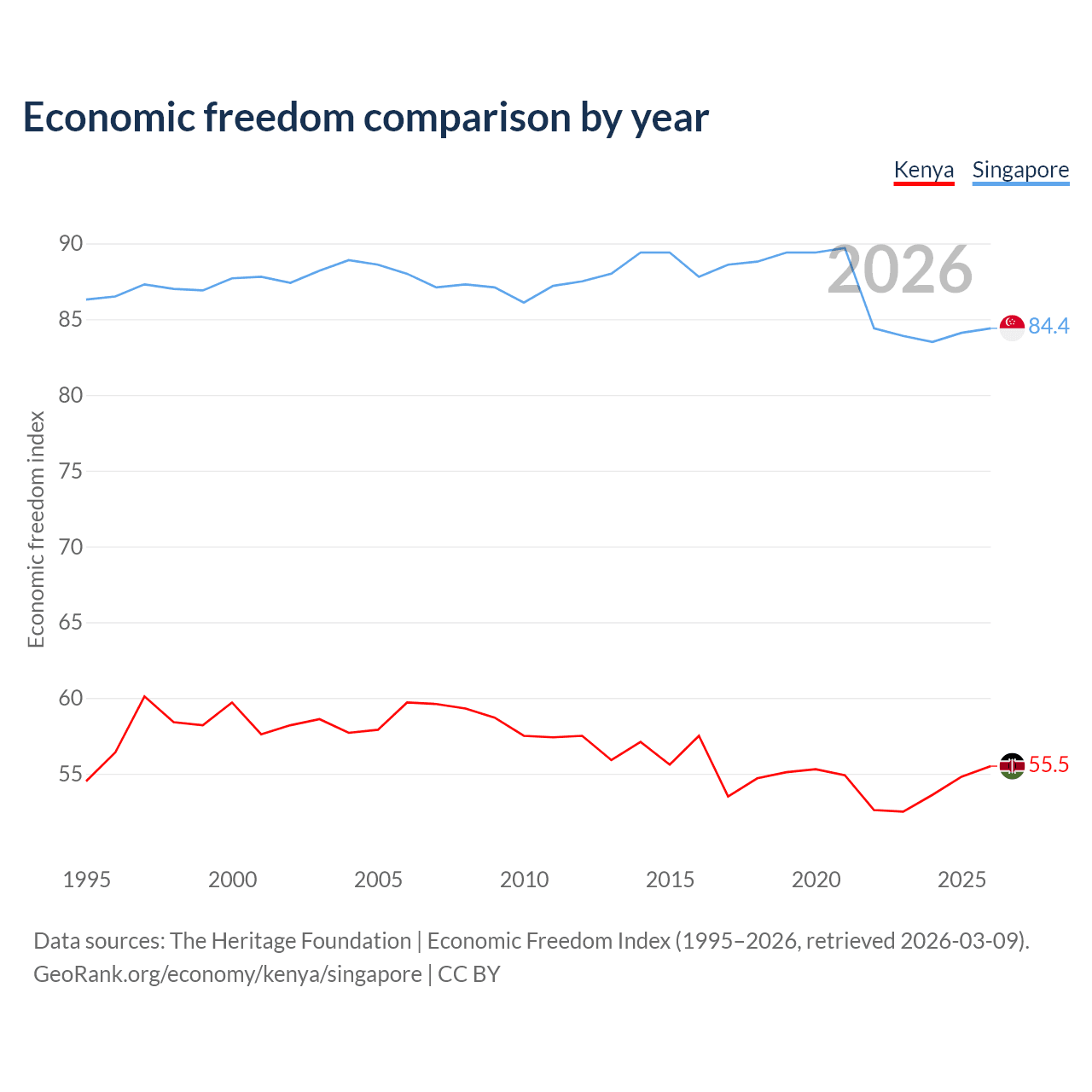 The Economic Freedom Index for Kenya is 55.5, ranking 128/197, compared to 84.4 for Singapore, ranking 1/197. The chart above displays a comparison of annual changes in economic freedom indexes.