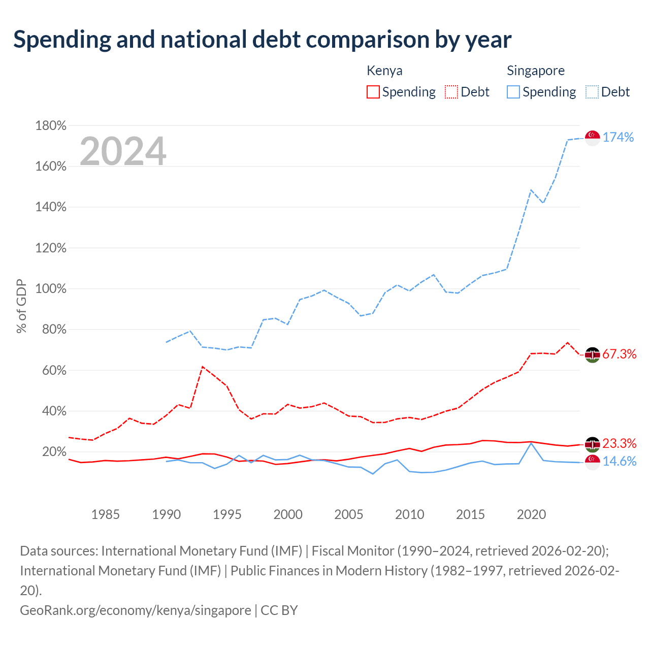 Kenya has $81B in government debt (67.3% of GDP), compared to $950B (173.5% of GDP) in Singapore.