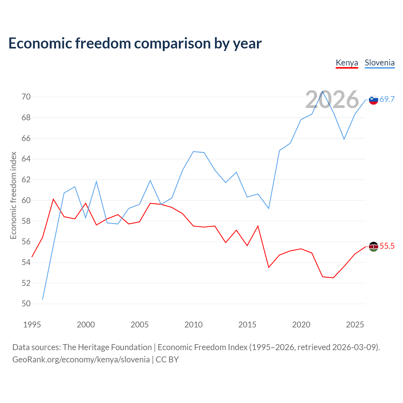 The Economic Freedom Index for Kenya is 55.5, ranking 128/197, compared to 69.7 for Slovenia, ranking 40/197. The chart above displays a comparison of annual changes in economic freedom indexes.