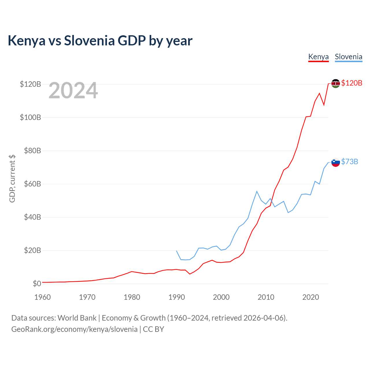 Kenya has a GDP of $120B compared to $73B for Slovenia, ranking 64/197 and 86/197 by economy size, respectively.
