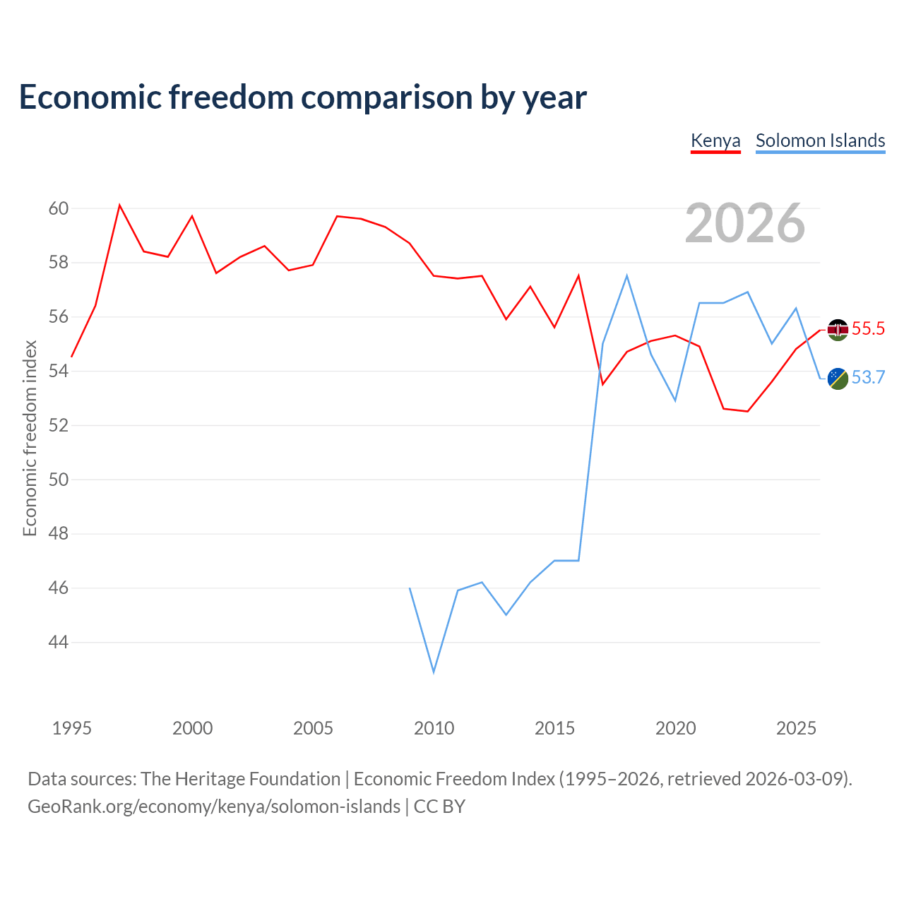 The Economic Freedom Index for Kenya is 55.5, ranking 128/197, compared to 53.7 for the Solomon Islands, ranking 137/197. The chart above displays a comparison of annual changes in economic freedom indexes.