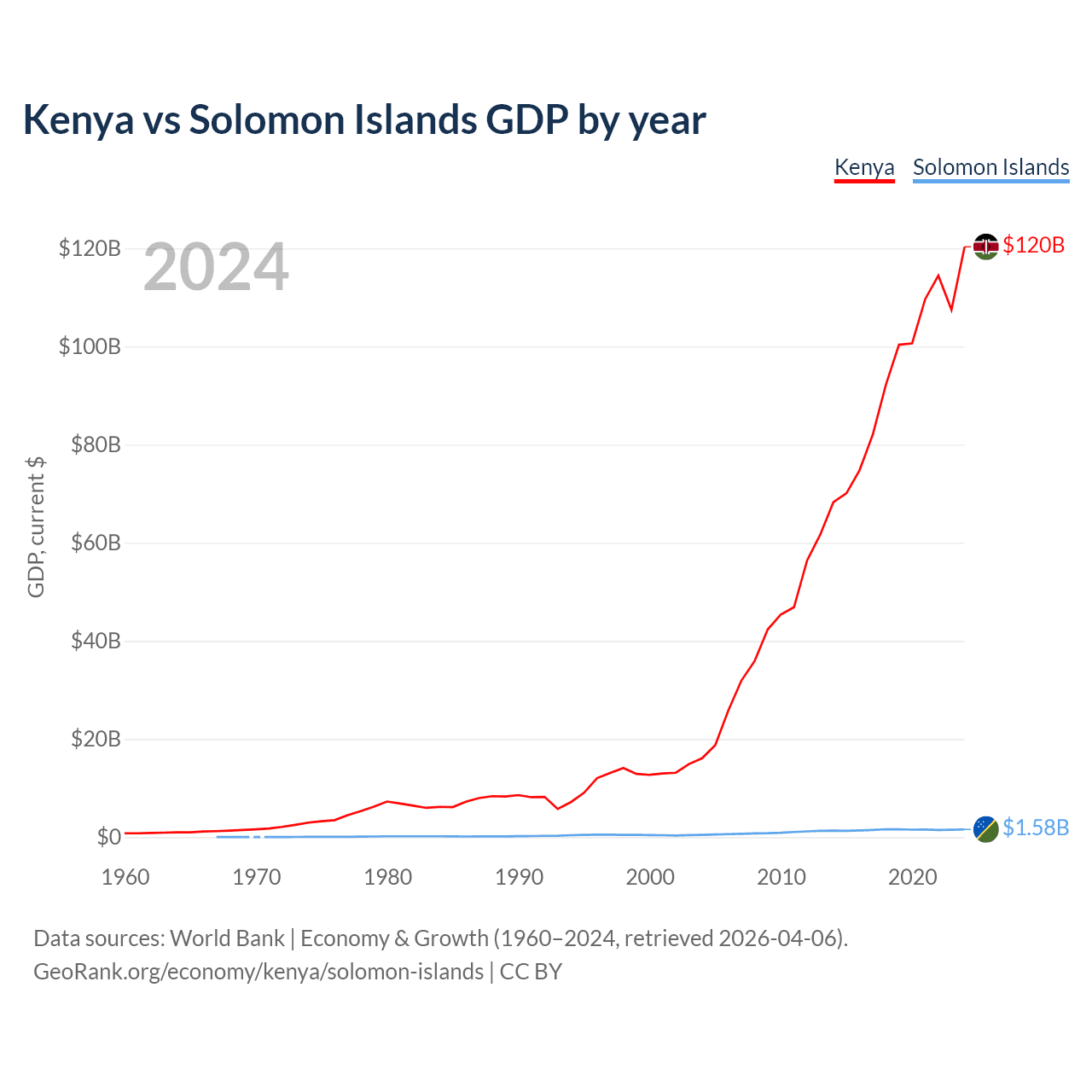 Kenya has a GDP of $120B compared to $1.58B for the Solomon Islands, ranking 64/197 and 182/197 by economy size, respectively.