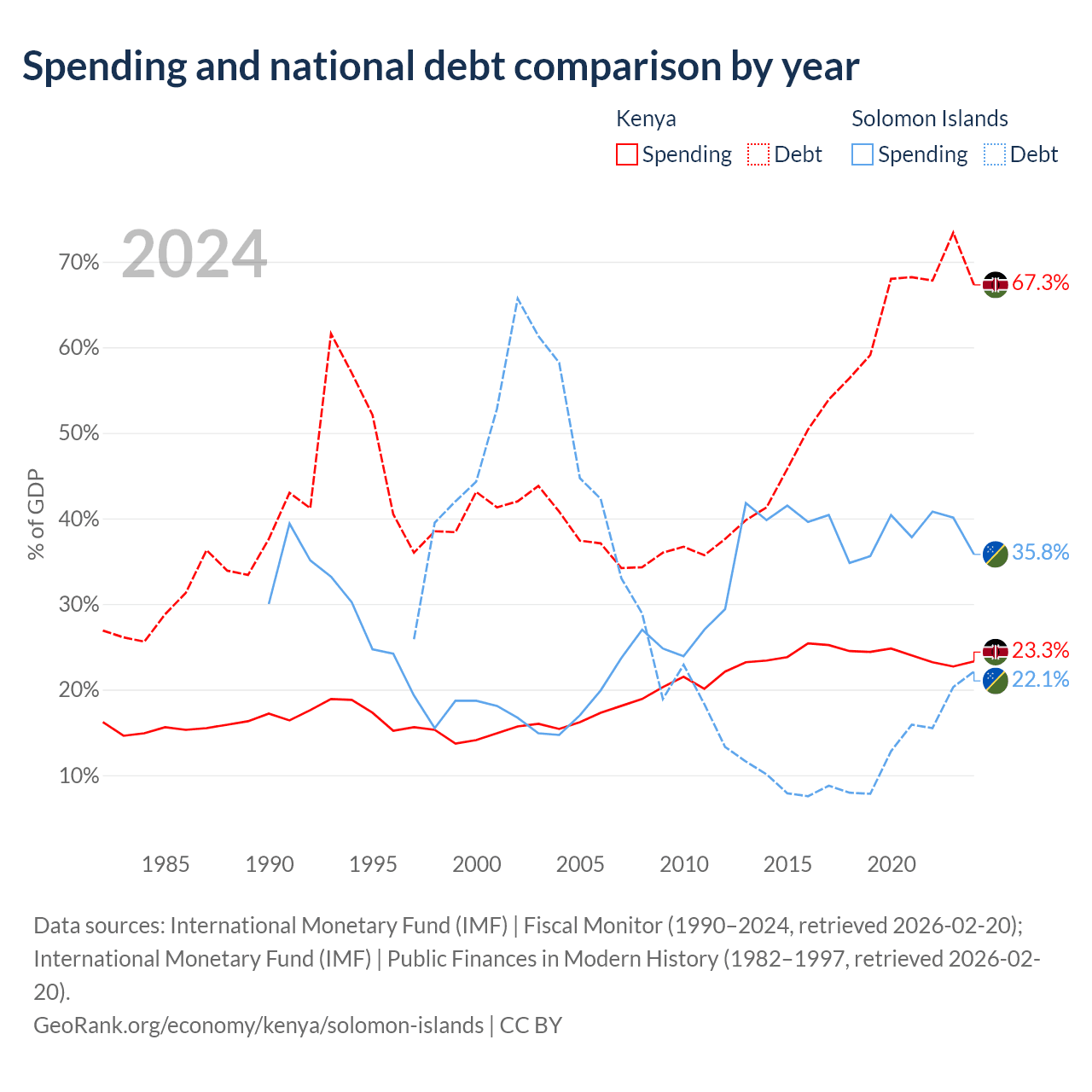 Kenya has $81B in government debt (67.3% of GDP), compared to $350M (22.1% of GDP) in the Solomon Islands.