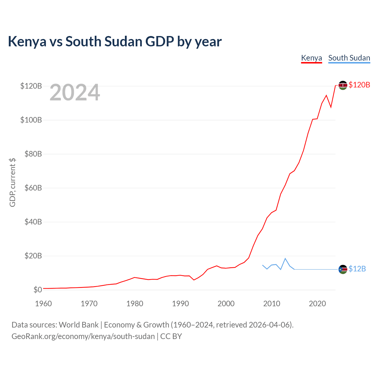 Kenya has a GDP of $120B compared to $12B for South Sudan, ranking 64/197 and 149/197 by economy size, respectively.