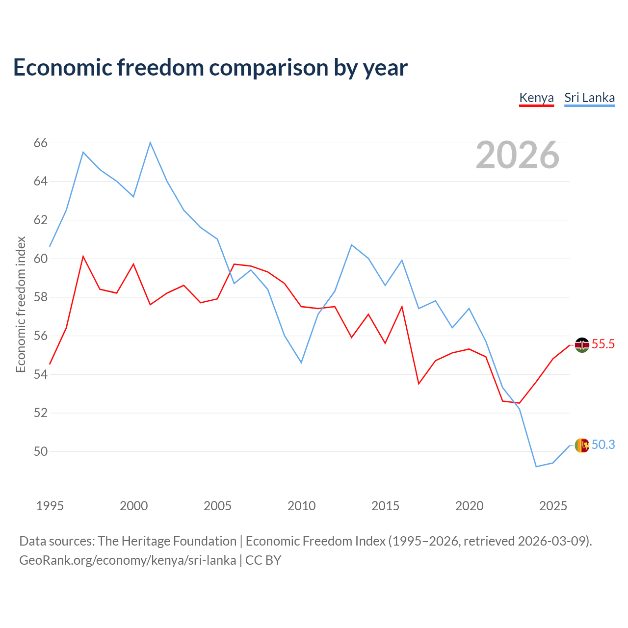 The Economic Freedom Index for Kenya is 55.5, ranking 128/197, compared to 50.3 for Sri Lanka, ranking 162/197. The chart above displays a comparison of annual changes in economic freedom indexes.