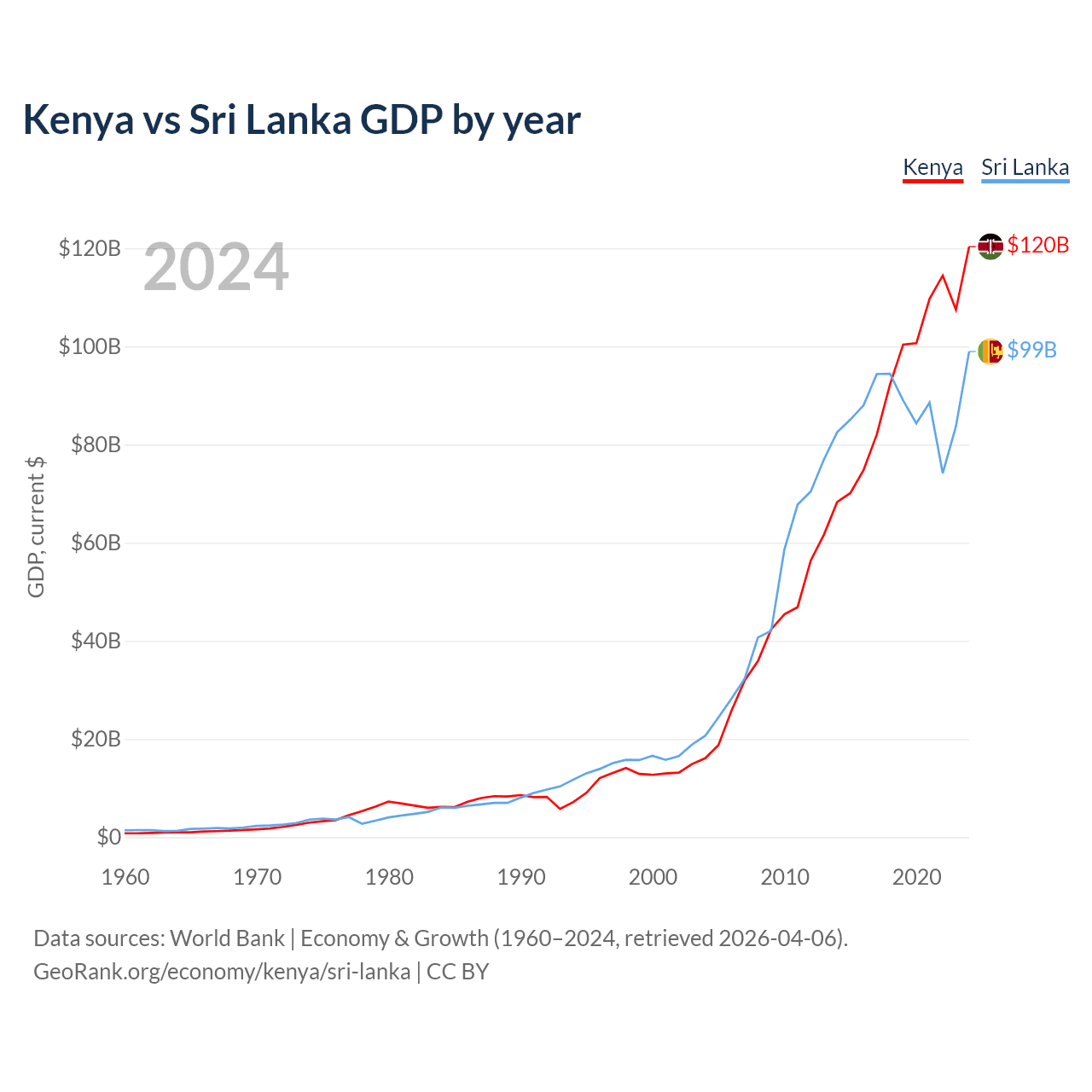 Kenya has a GDP of $120B compared to $99B for Sri Lanka, ranking 64/197 and 72/197 by economy size, respectively.