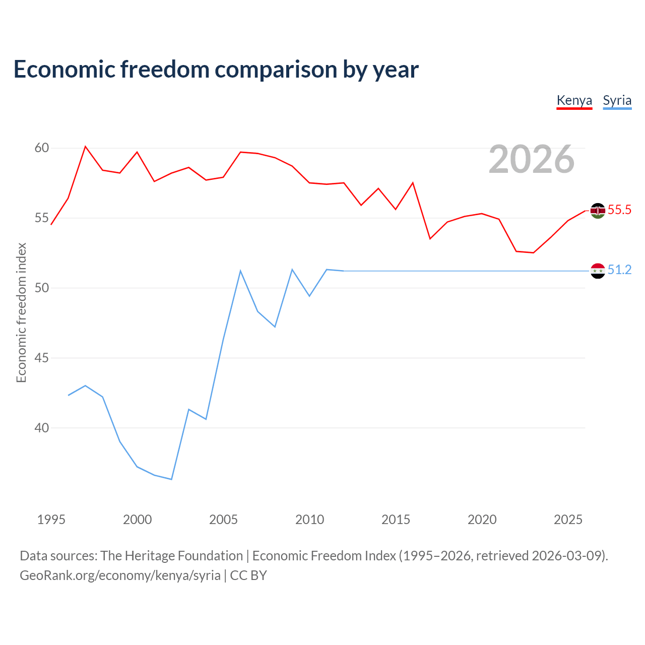 The Economic Freedom Index for Kenya is 55.5, ranking 128/197, compared to 51.2 for Syria, ranking 155/197. The chart above displays a comparison of annual changes in economic freedom indexes.