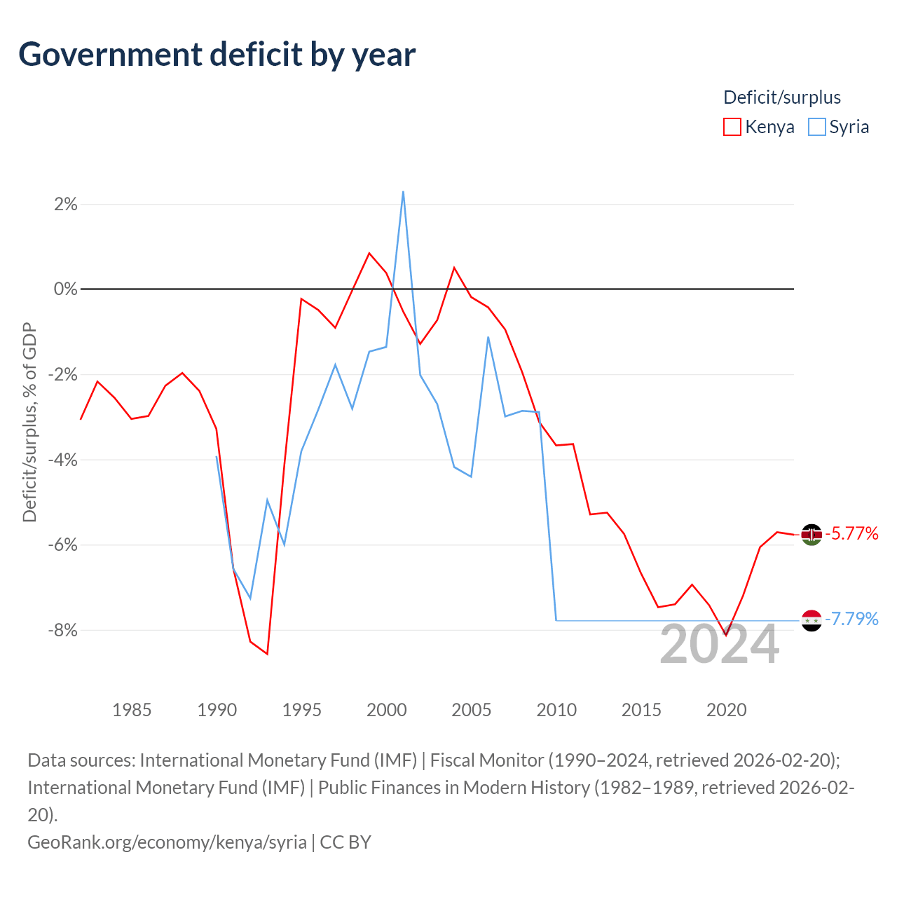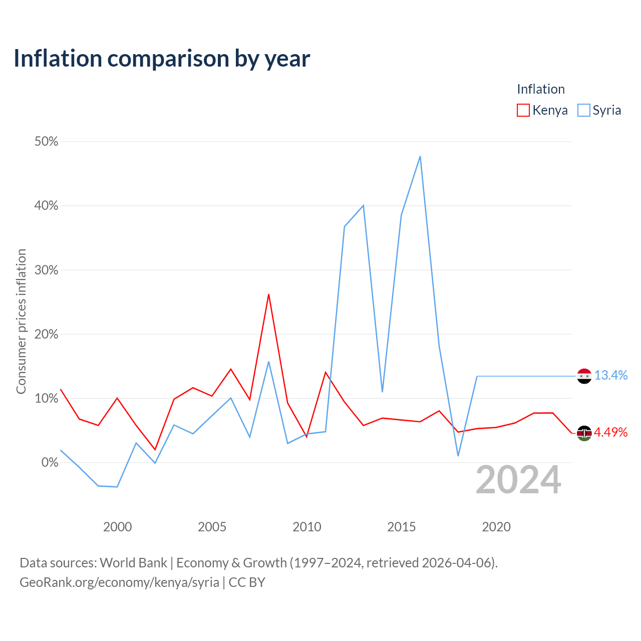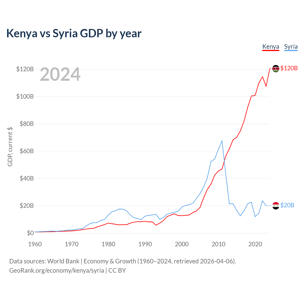 Kenya has a GDP of $120B compared to $20B for Syria, ranking 64/197 and 129/197 by economy size, respectively.