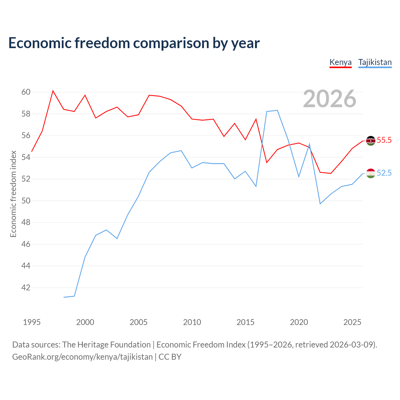 The Economic Freedom Index for Kenya is 55.5, ranking 128/197, compared to 52.5 for Tajikistan, ranking 147/197. The chart above displays a comparison of annual changes in economic freedom indexes.