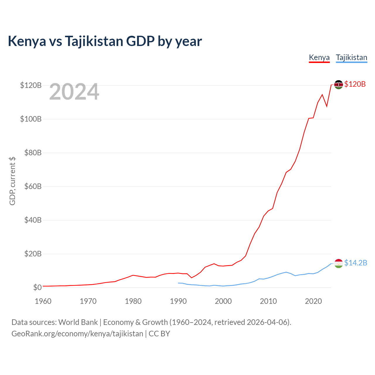 Kenya has a GDP of $120B compared to $14.2B for Tajikistan, ranking 64/197 and 145/197 by economy size, respectively.