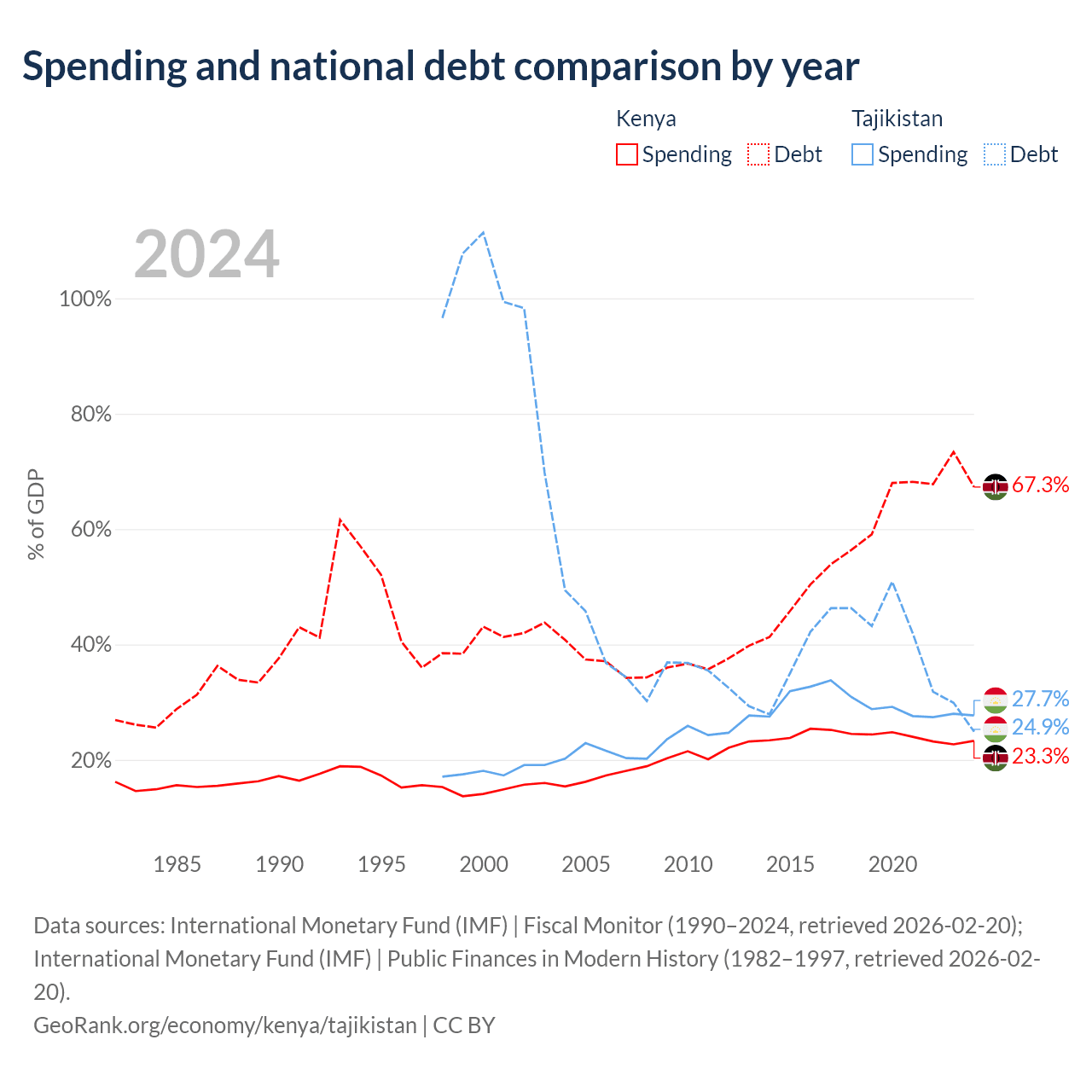 Kenya has $81B in government debt (67.3% of GDP), compared to $3.54B (24.9% of GDP) in Tajikistan.