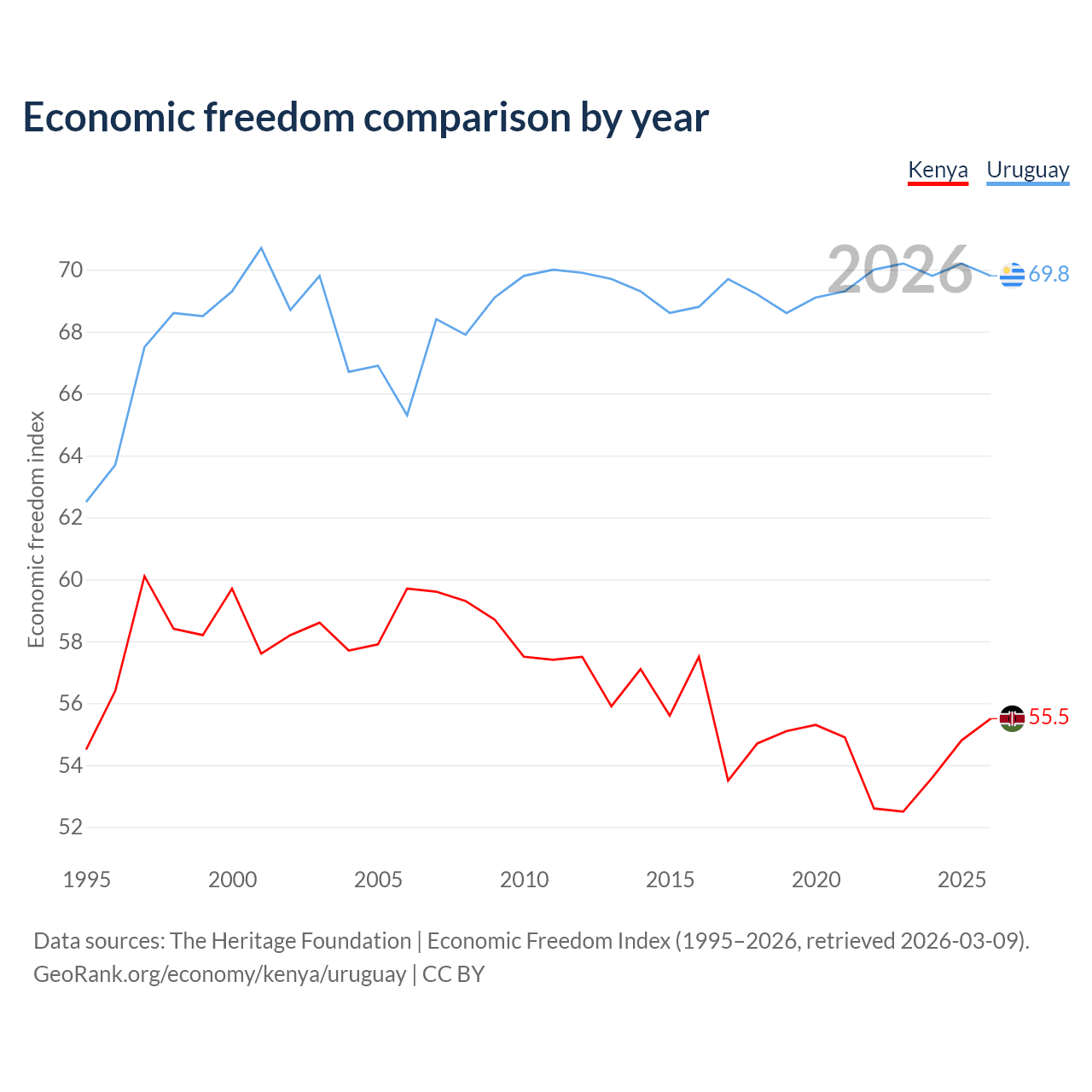 The Economic Freedom Index for Kenya is 55.5, ranking 128/197, compared to 69.8 for Uruguay, ranking 39/197. The chart above displays a comparison of annual changes in economic freedom indexes.