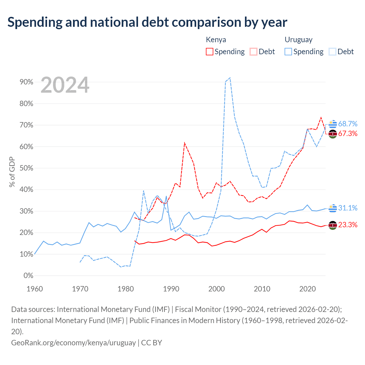 Kenya has $81B in government debt (67.3% of GDP), compared to $55.6B (68.7% of GDP) in Uruguay.