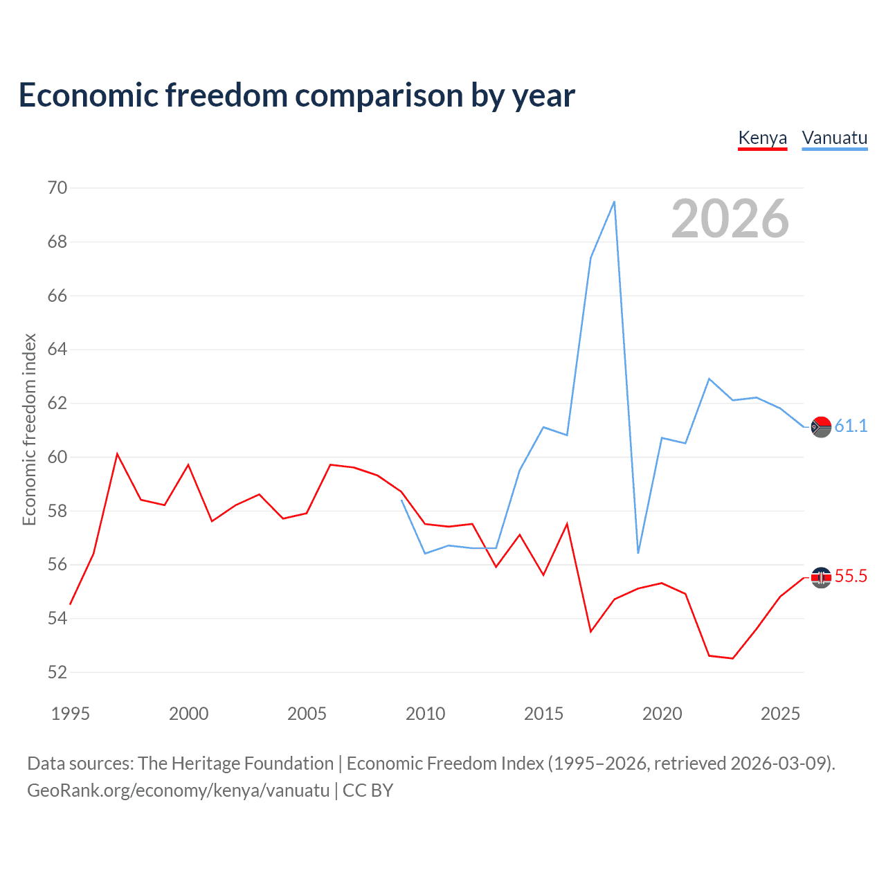The Economic Freedom Index for Kenya is 55.5, ranking 128/197, compared to 61.1 for Vanuatu, ranking 92/197. The chart above displays a comparison of annual changes in economic freedom indexes.
