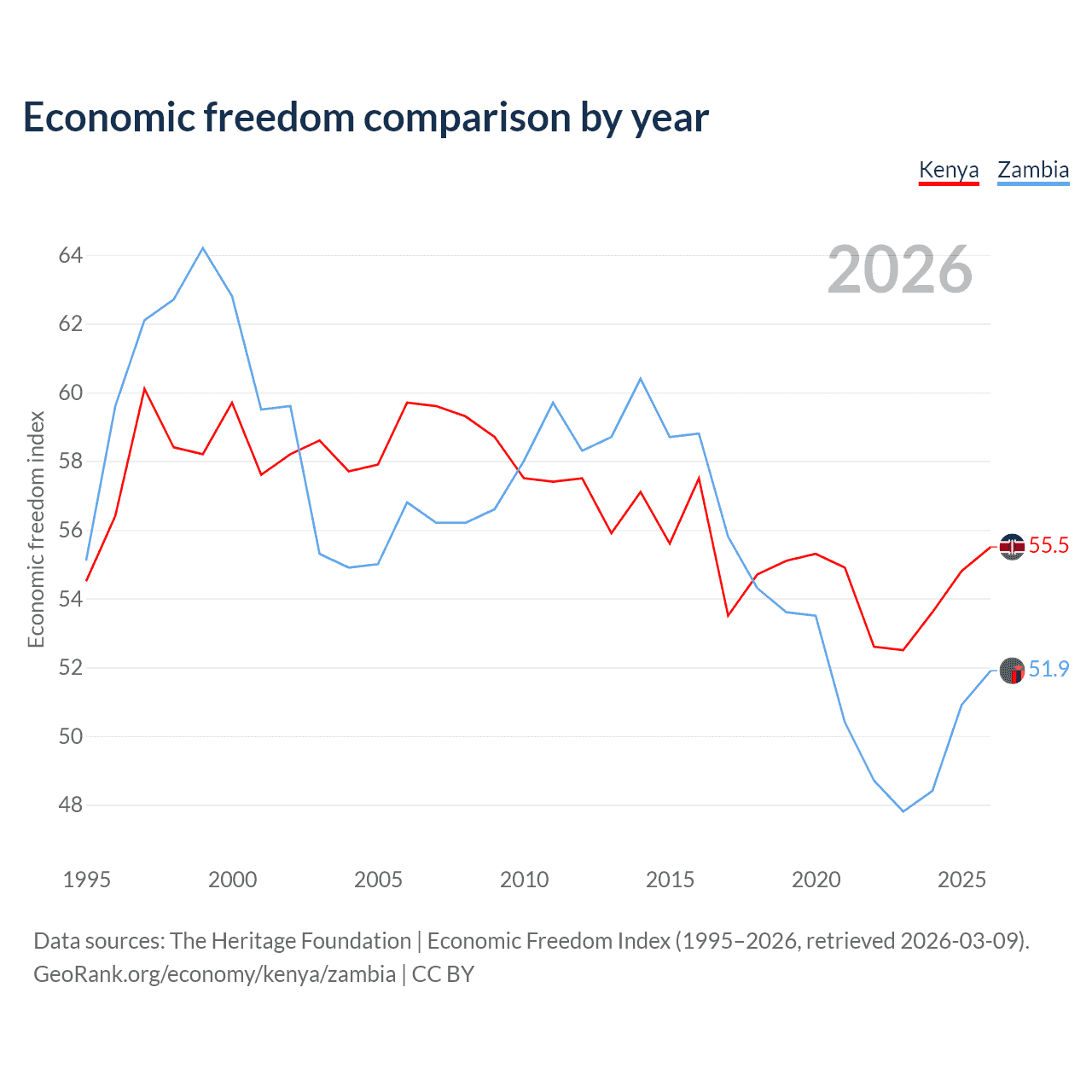 The Economic Freedom Index for Kenya is 55.5, ranking 128/197, compared to 51.9 for Zambia, ranking 152/197. The chart above displays a comparison of annual changes in economic freedom indexes.