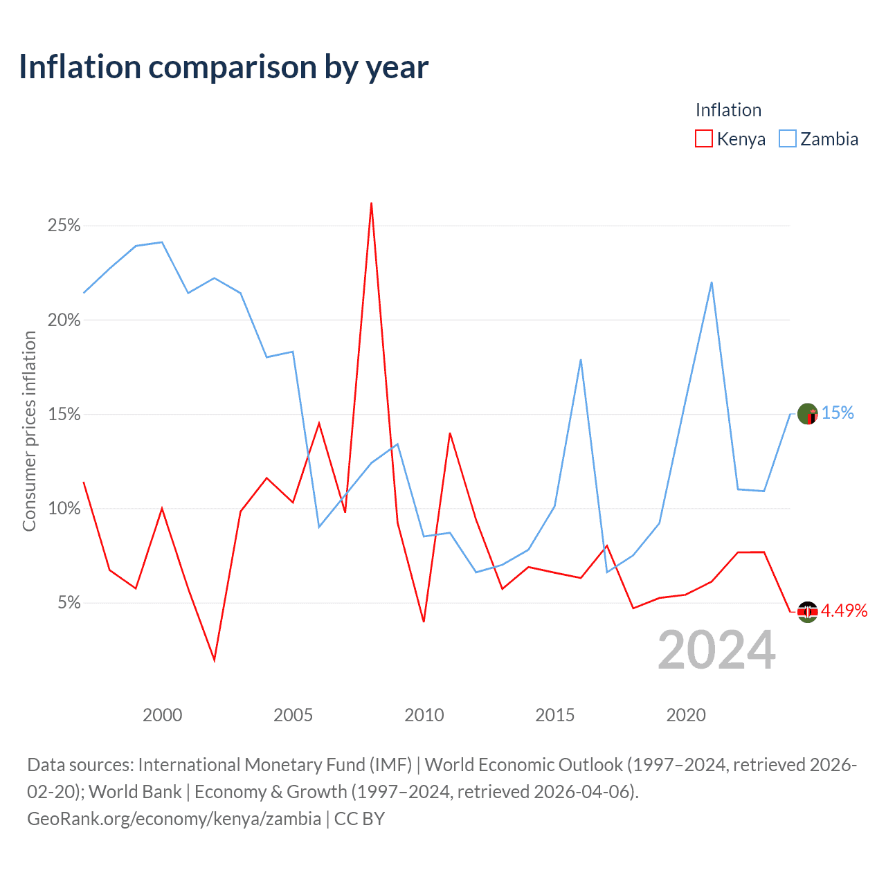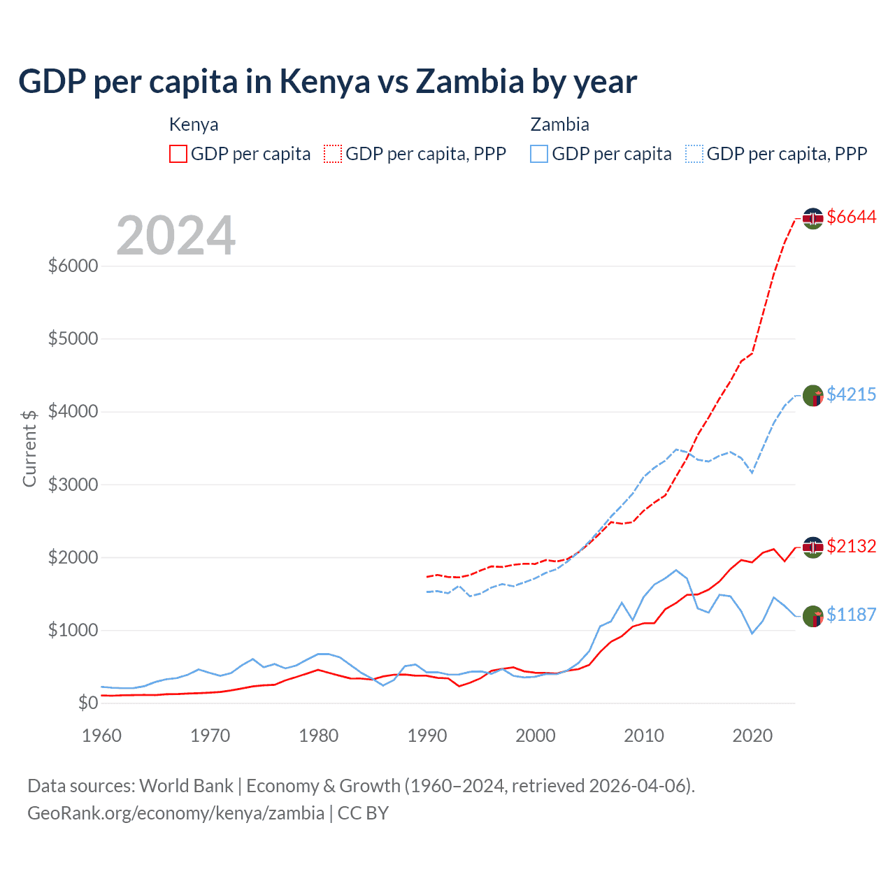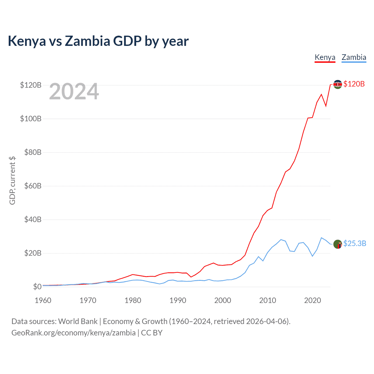 Kenya has a GDP of $120B compared to $25.3B for Zambia, ranking 64/197 and 116/197 by economy size, respectively.