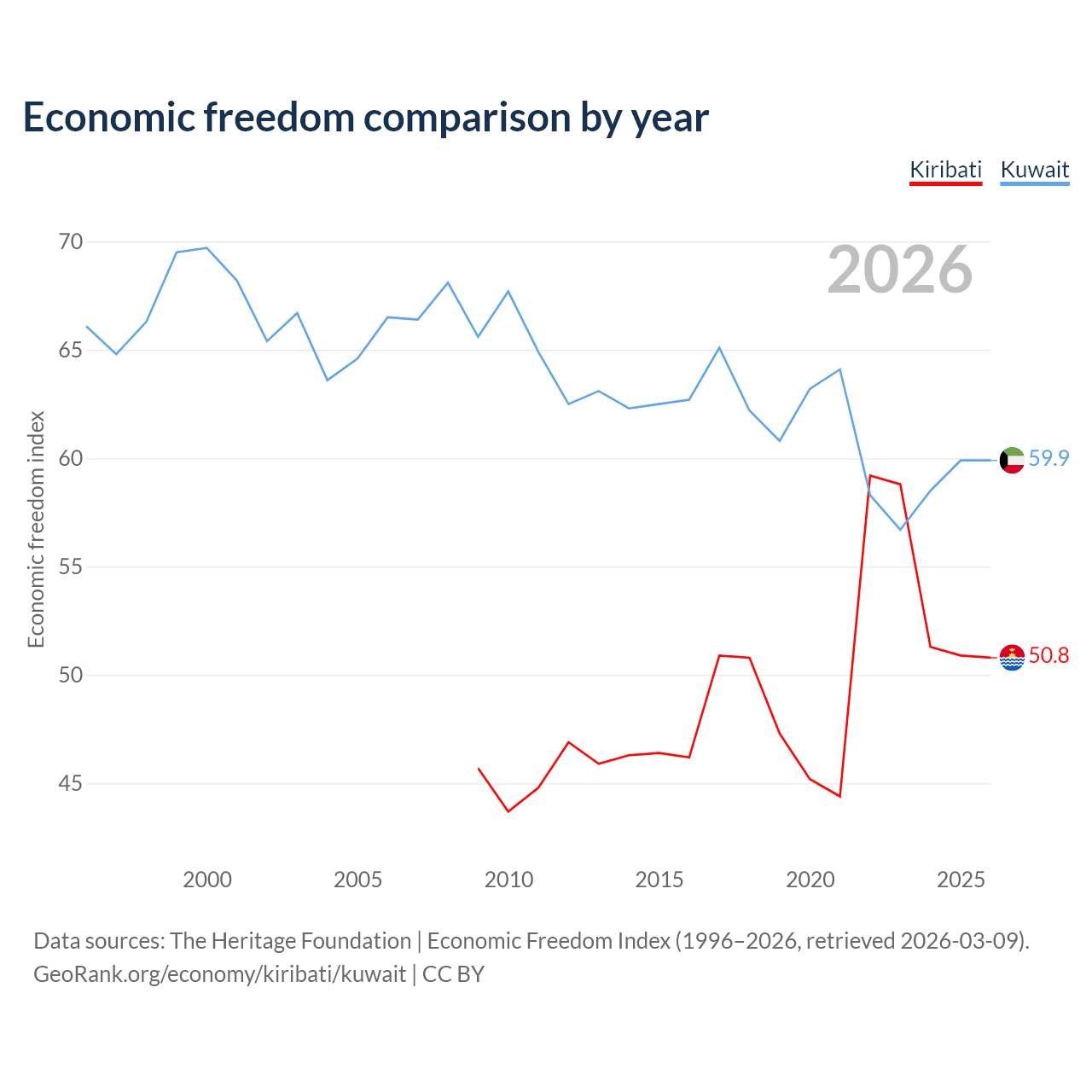 The Economic Freedom Index for Kiribati is 50.8, ranking 158/197, compared to 59.9 for Kuwait, ranking 100/197. The chart above displays a comparison of annual changes in economic freedom indexes.