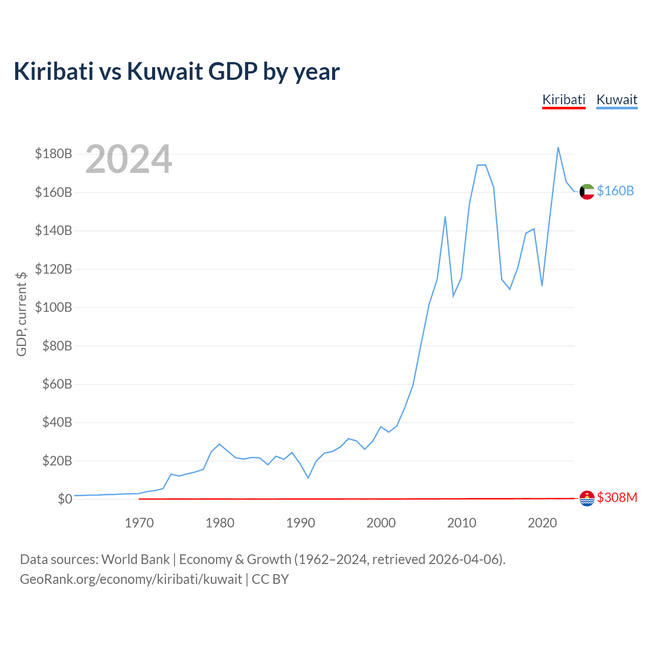 Kiribati has a GDP of $308M compared to $160B for Kuwait, ranking 192/197 and 59/197 by economy size, respectively.