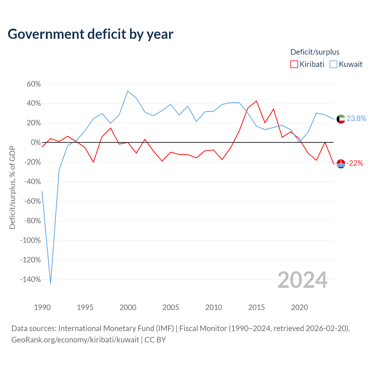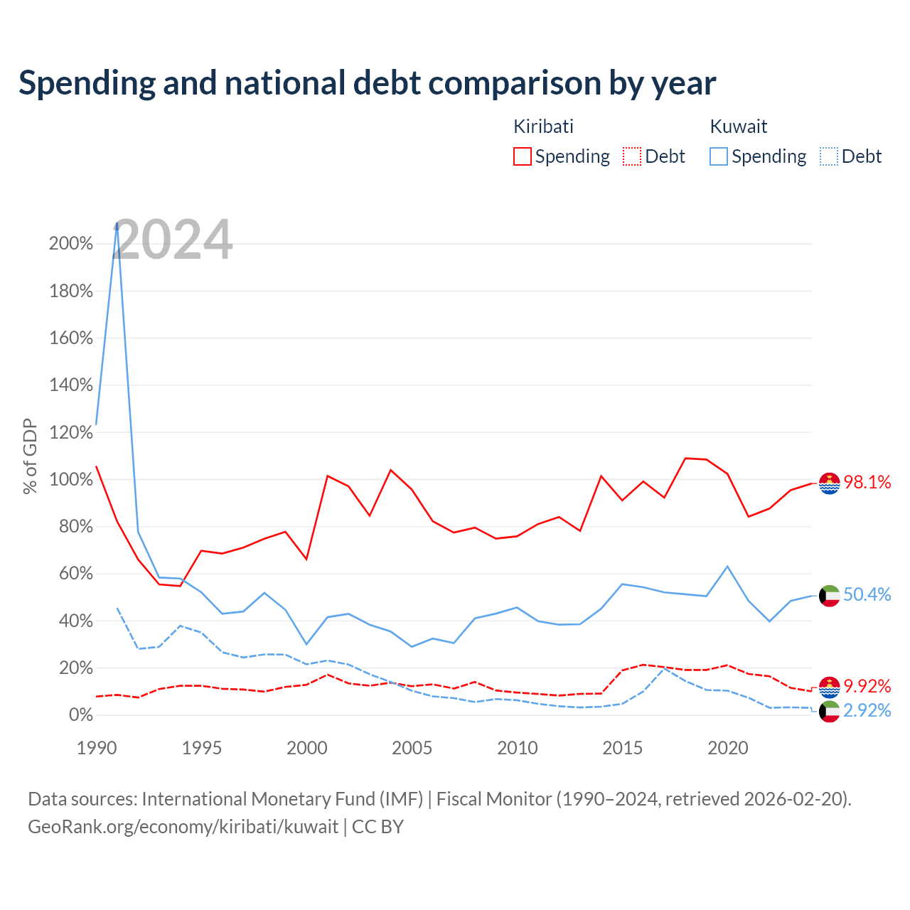 Kiribati has $30.5M in government debt (9.92% of GDP), compared to $4.68B (2.92% of GDP) in Kuwait.