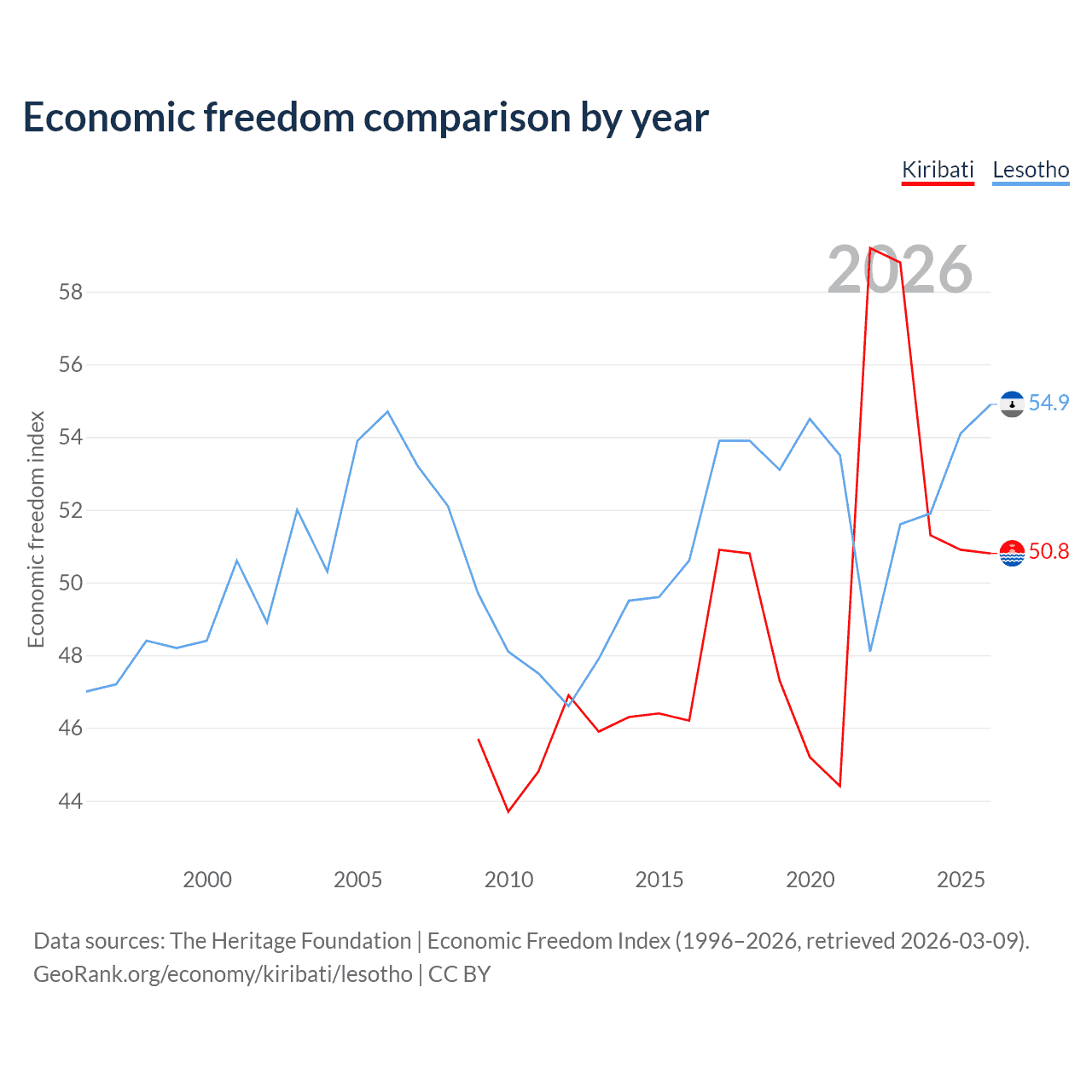 The Economic Freedom Index for Kiribati is 50.8, ranking 158/197, compared to 54.9 for Lesotho, ranking 130/197. The chart above displays a comparison of annual changes in economic freedom indexes.