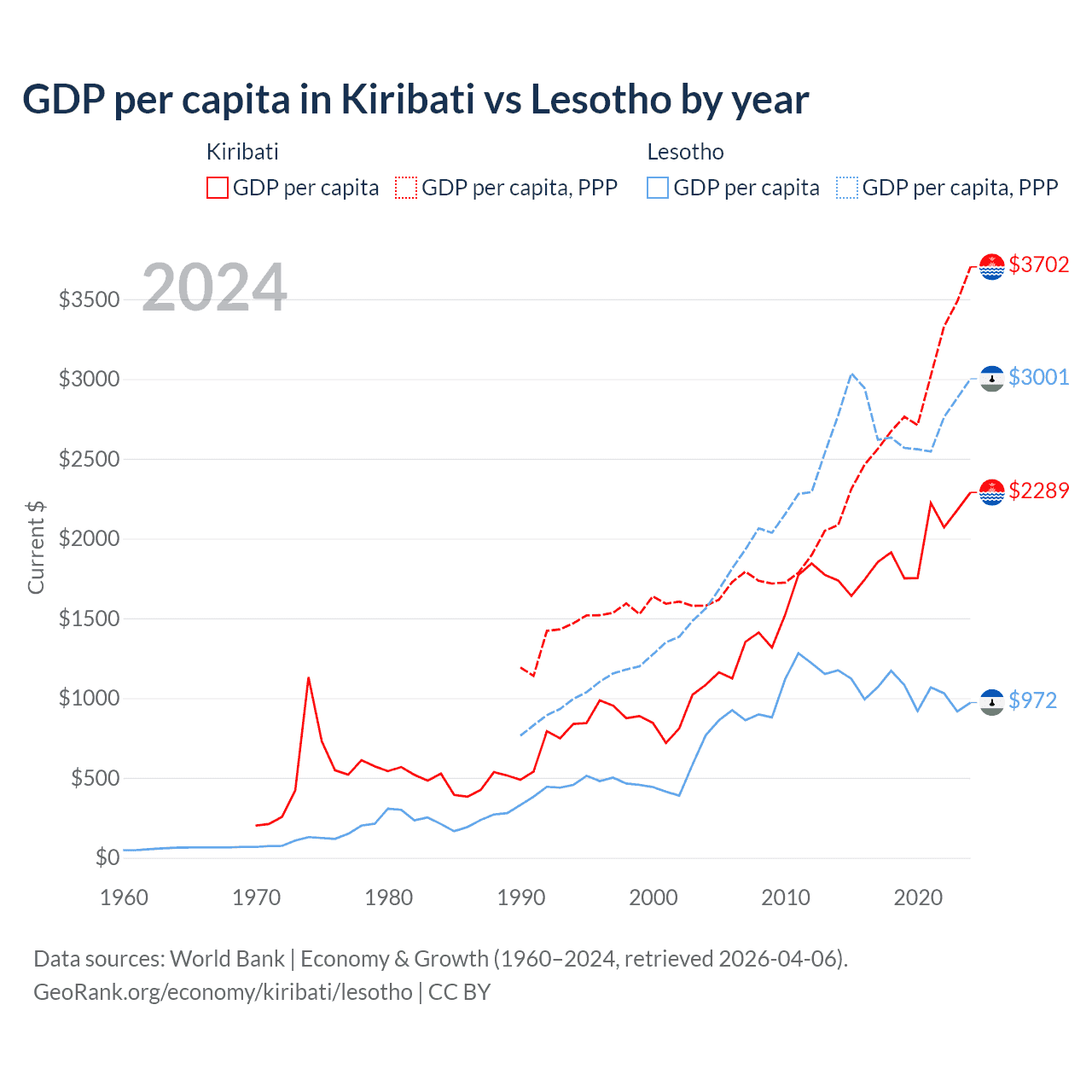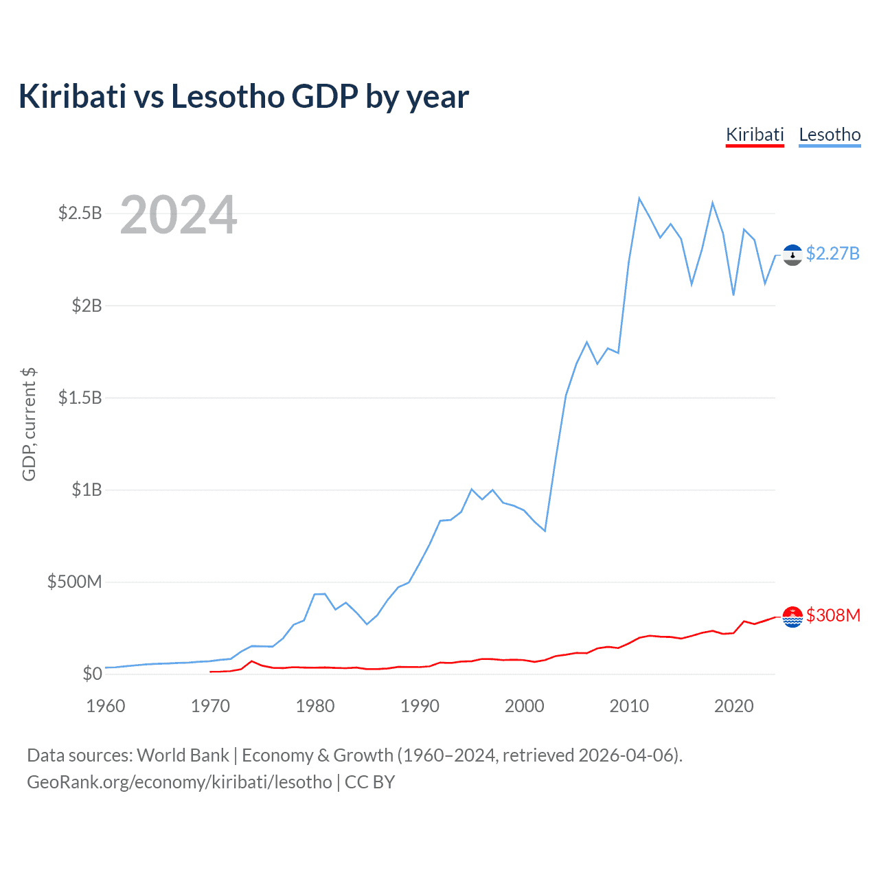 Kiribati has a GDP of $308M compared to $2.27B for Lesotho, ranking 192/197 and 175/197 by economy size, respectively.