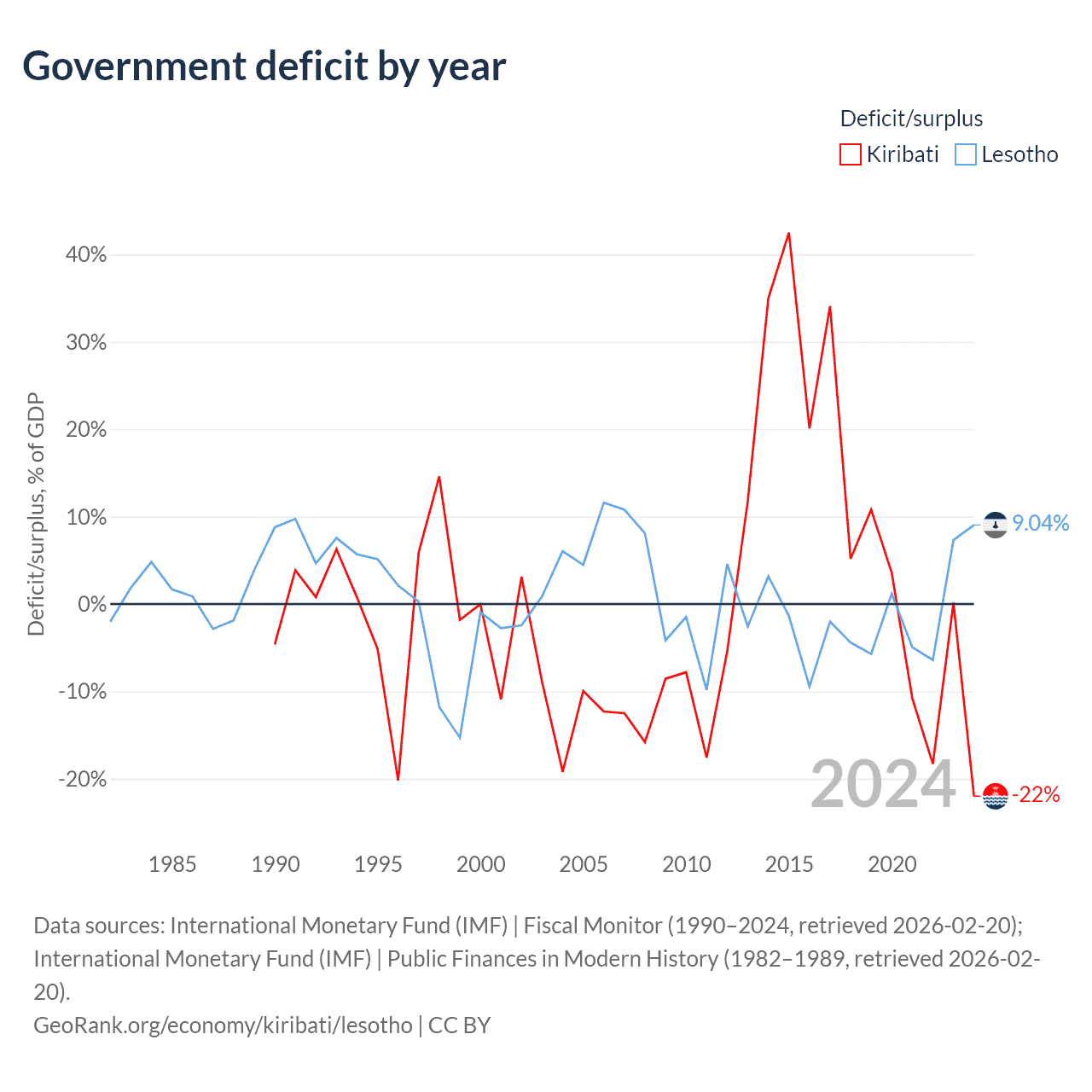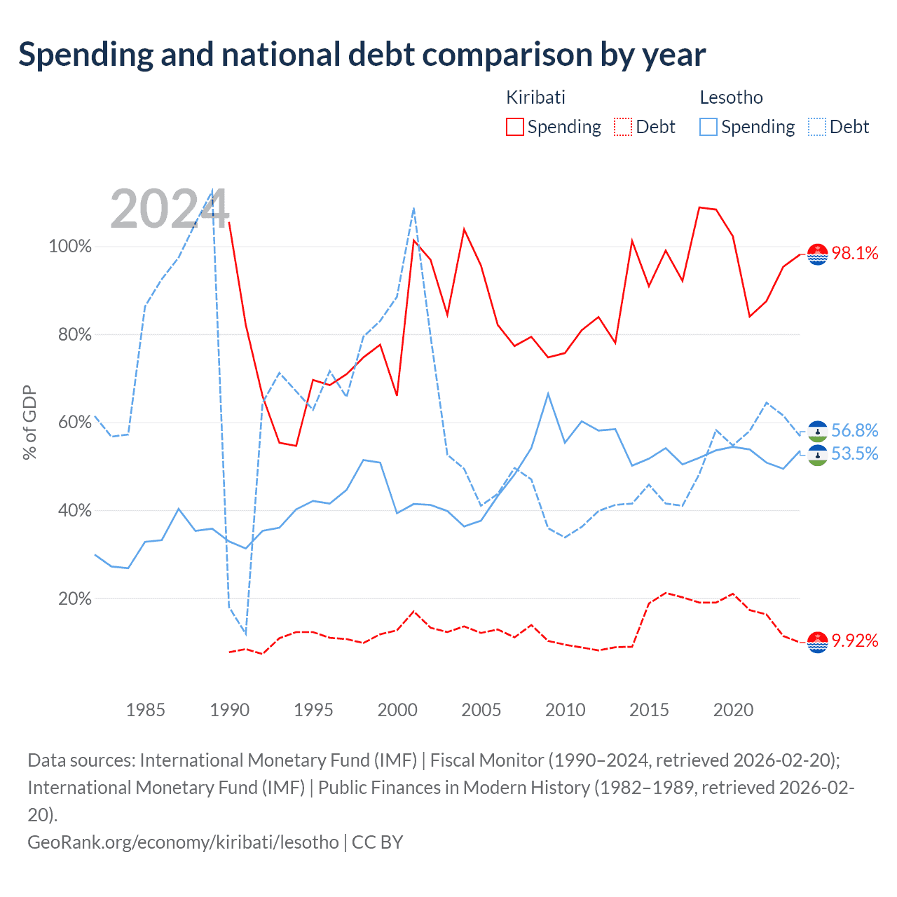 Kiribati has $30.5M in government debt (9.92% of GDP), compared to $1.29B (56.8% of GDP) in Lesotho.