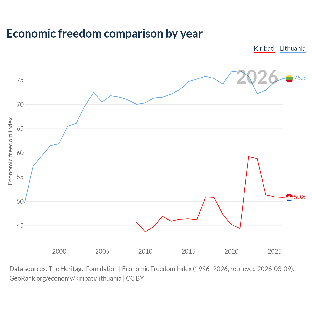 The Economic Freedom Index for Kiribati is 50.8, ranking 158/197, compared to 75.3 for Lithuania, ranking 18/197. The chart above displays a comparison of annual changes in economic freedom indexes.
