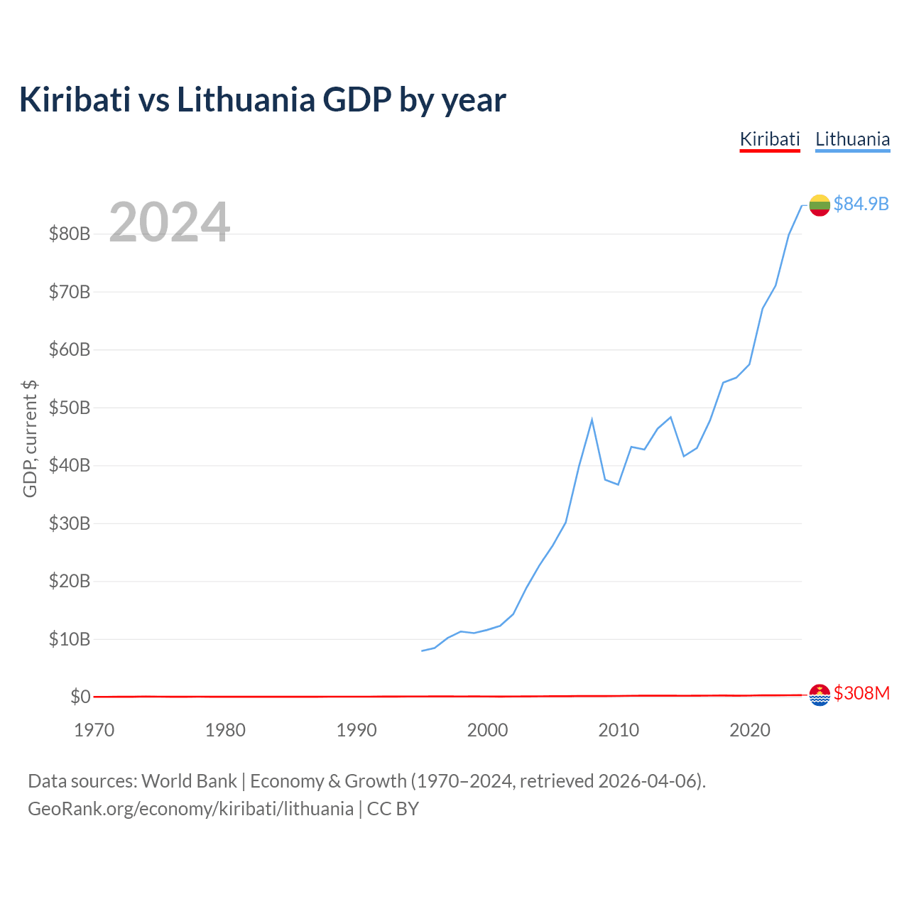 Kiribati has a GDP of $308M compared to $84.9B for Lithuania, ranking 192/197 and 79/197 by economy size, respectively.
