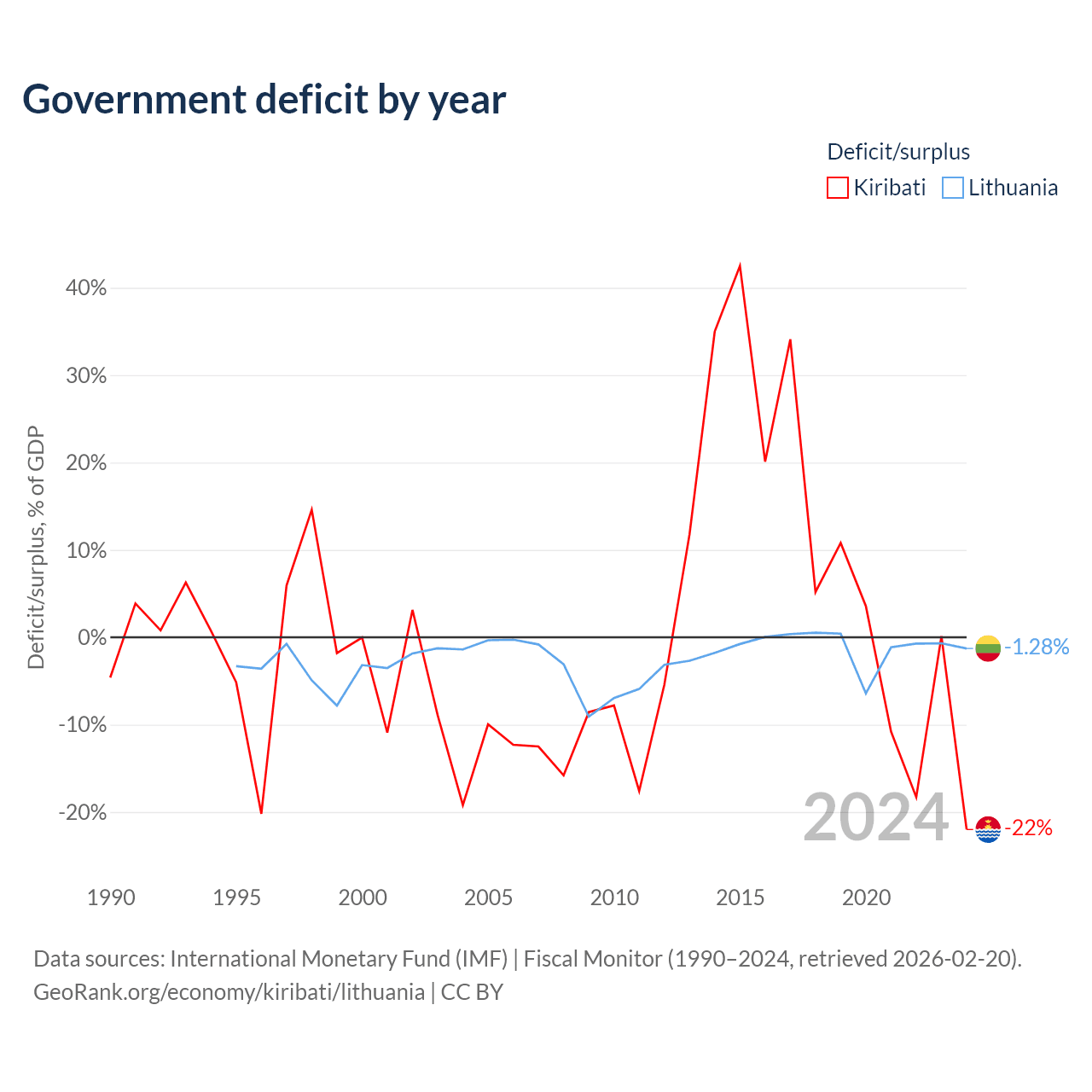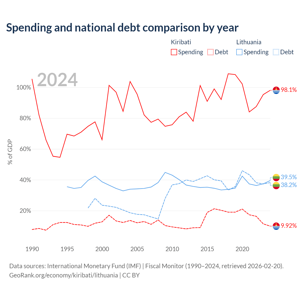Kiribati has $30.5M in government debt (9.92% of GDP), compared to $32.4B (38.2% of GDP) in Lithuania.