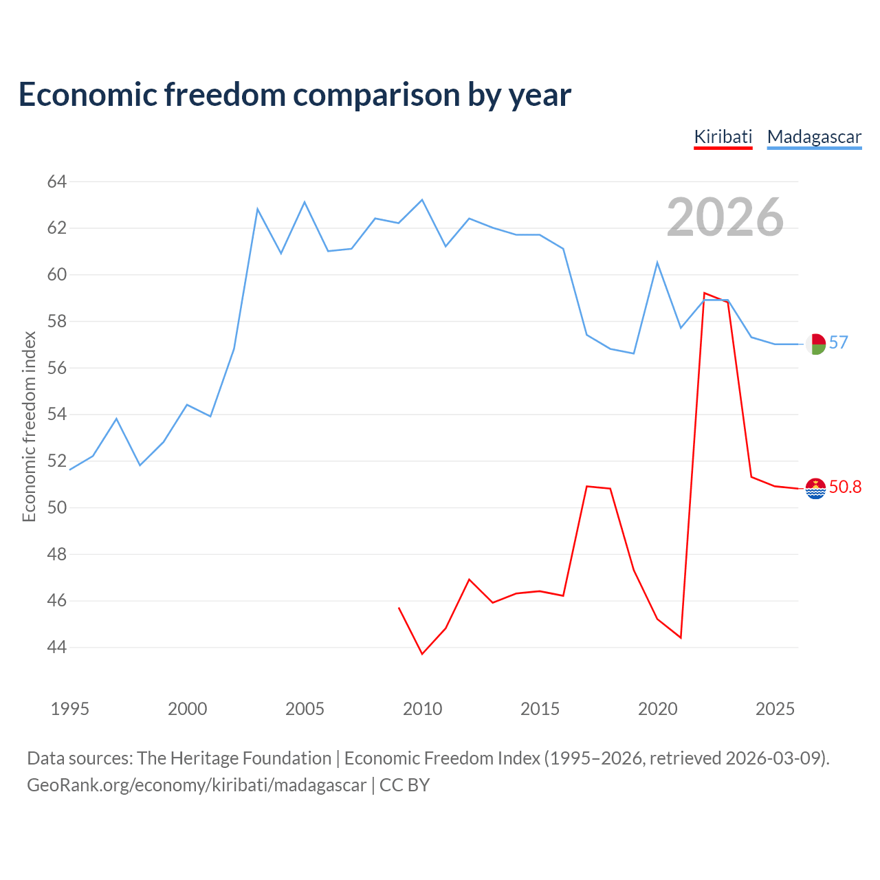 The Economic Freedom Index for Kiribati is 50.8, ranking 158/197, compared to 57 for Madagascar, ranking 119/197. The chart above displays a comparison of annual changes in economic freedom indexes.