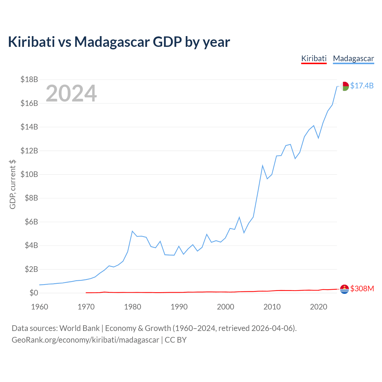 Kiribati has a GDP of $308M compared to $17.4B for Madagascar, ranking 192/197 and 136/197 by economy size, respectively.