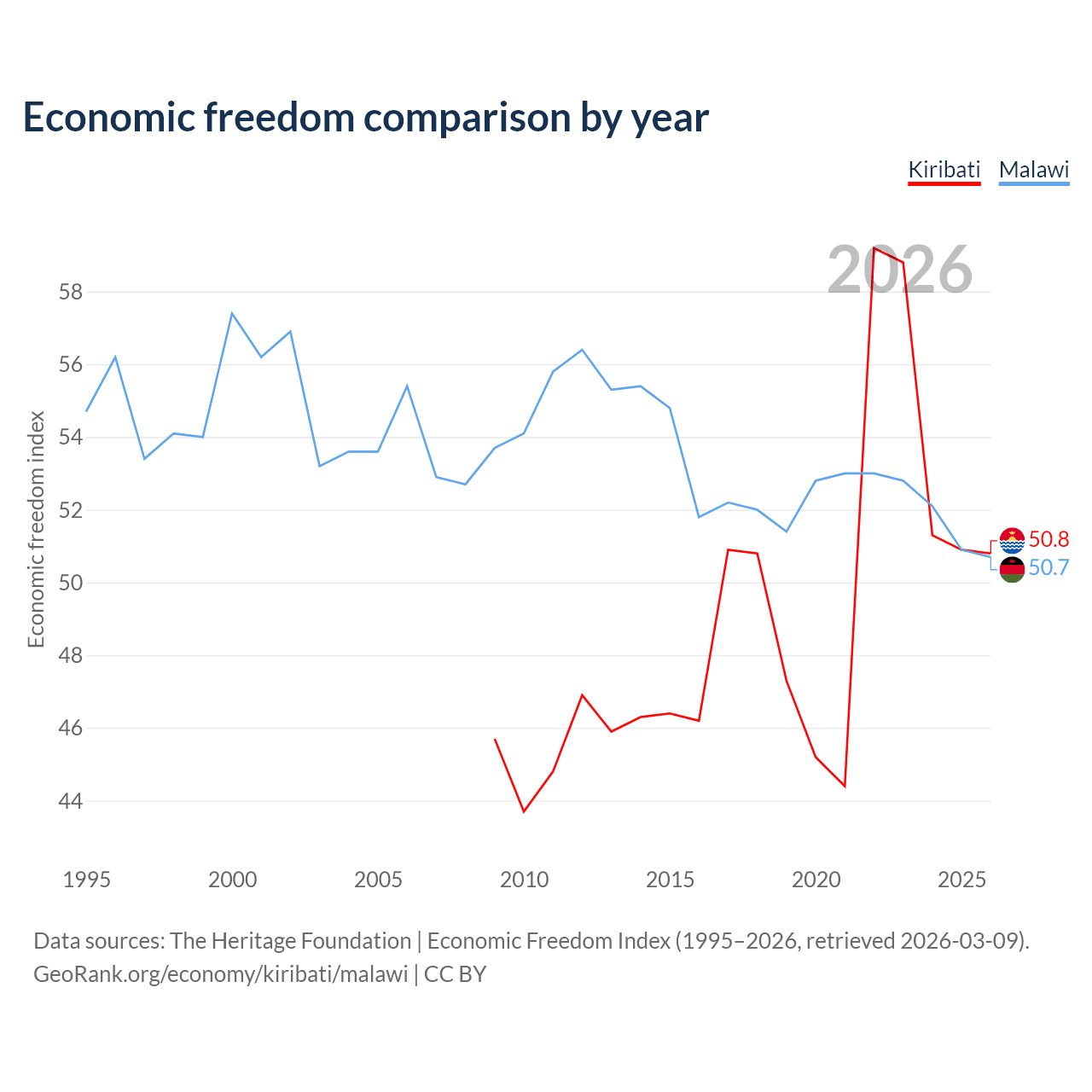 The Economic Freedom Index for Kiribati is 50.8, ranking 158/197, compared to 50.7 for Malawi, ranking 159/197. The chart above displays a comparison of annual changes in economic freedom indexes.