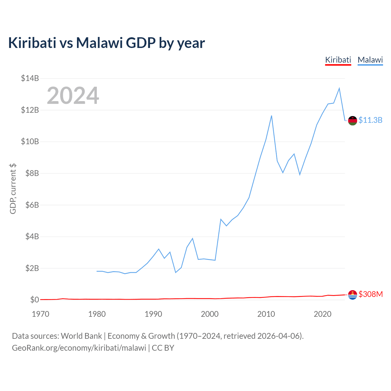 Kiribati has a GDP of $308M compared to $11.3B for Malawi, ranking 192/197 and 151/197 by economy size, respectively.