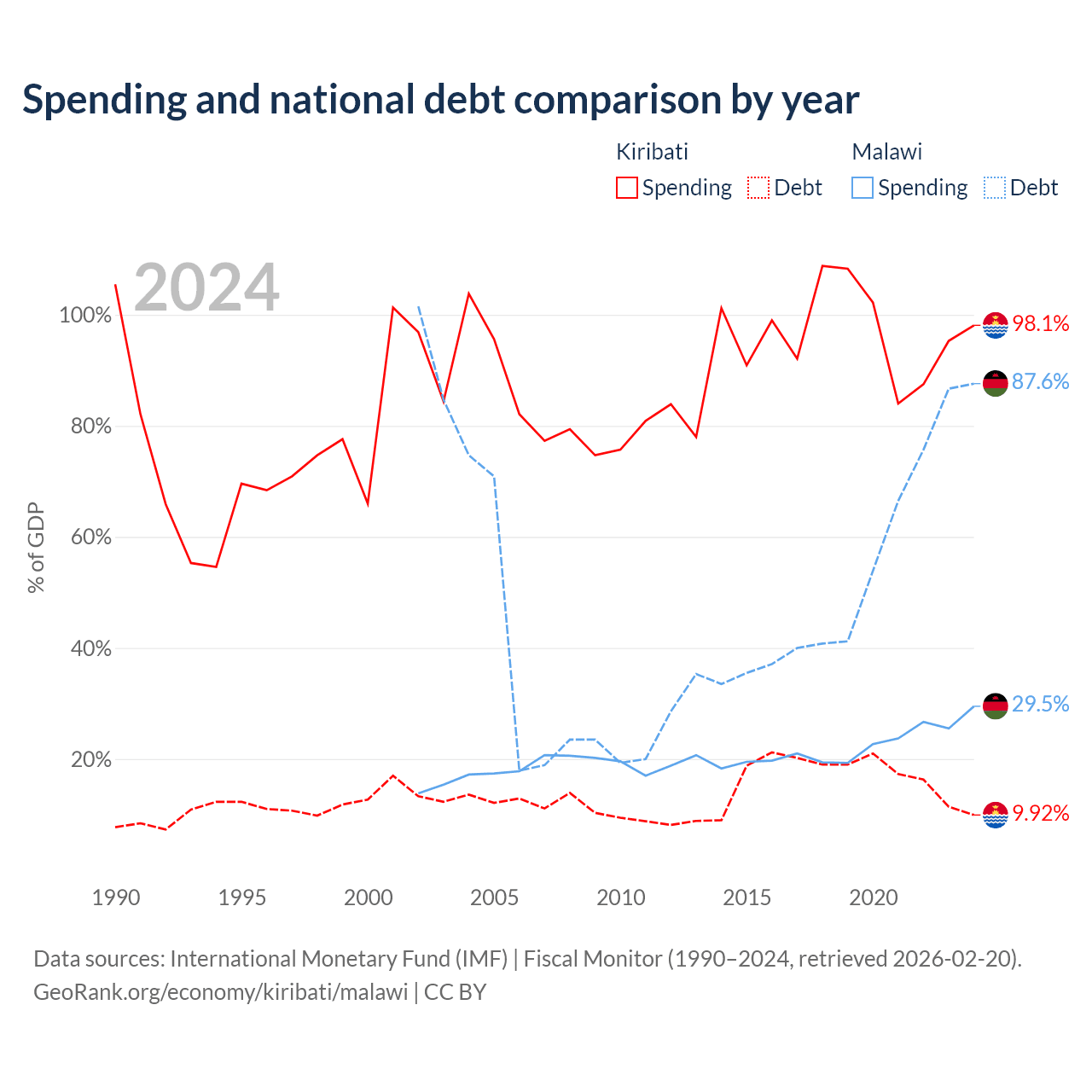 Kiribati has $30.5M in government debt (9.92% of GDP), compared to $9.91B (87.6% of GDP) in Malawi.