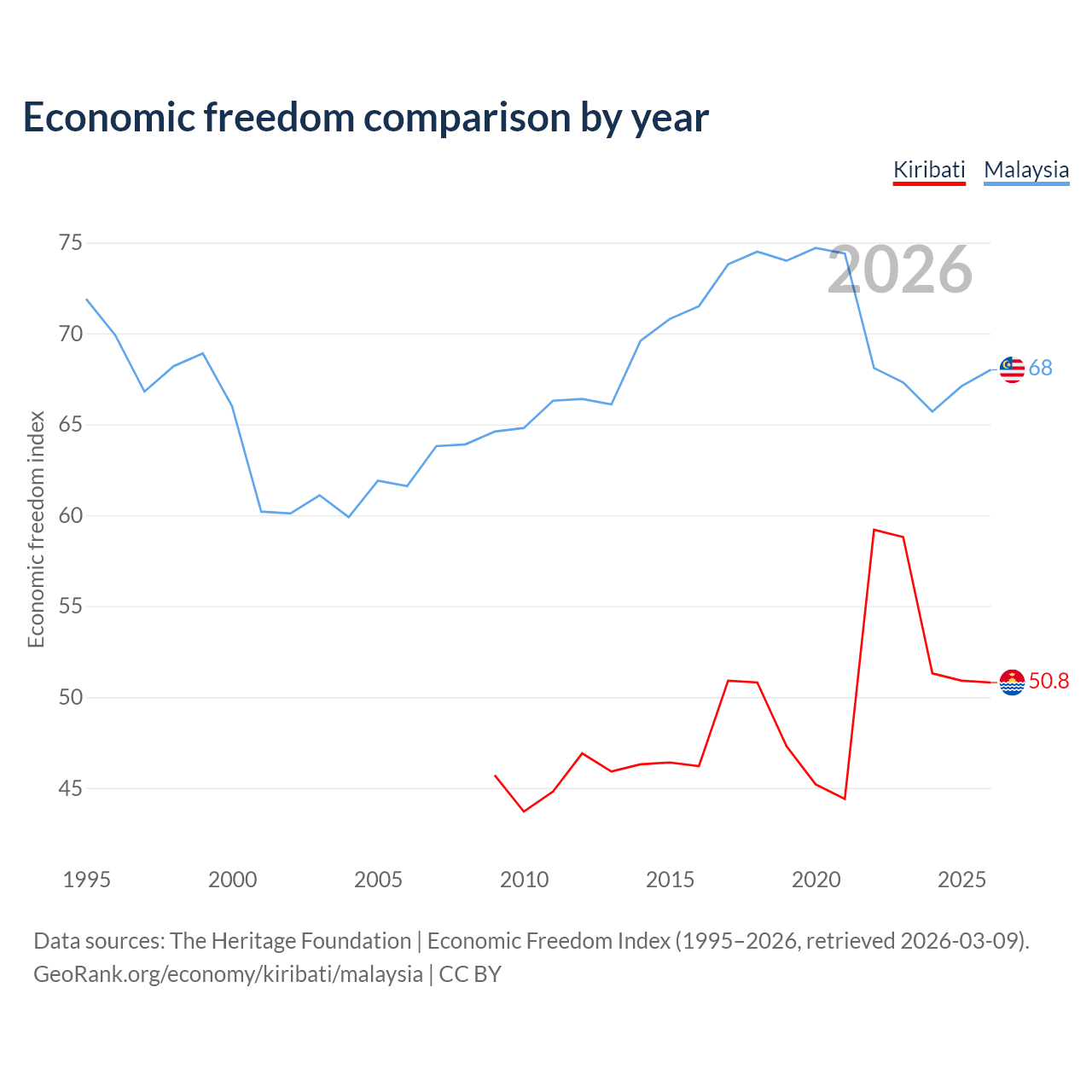 The Economic Freedom Index for Kiribati is 50.8, ranking 158/197, compared to 68 for Malaysia, ranking 51/197. The chart above displays a comparison of annual changes in economic freedom indexes.