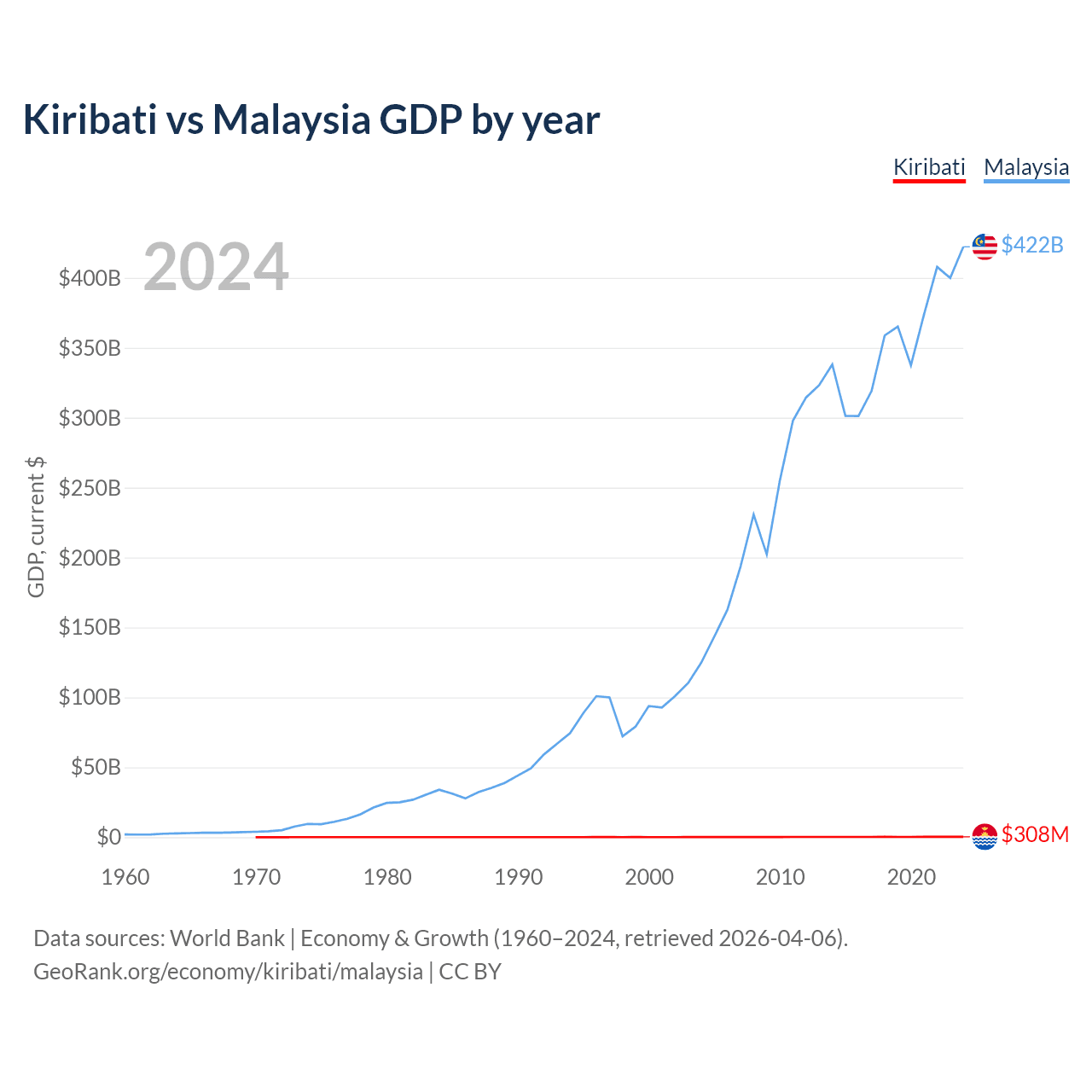 Kiribati has a GDP of $308M compared to $422B for Malaysia, ranking 192/197 and 38/197 by economy size, respectively.