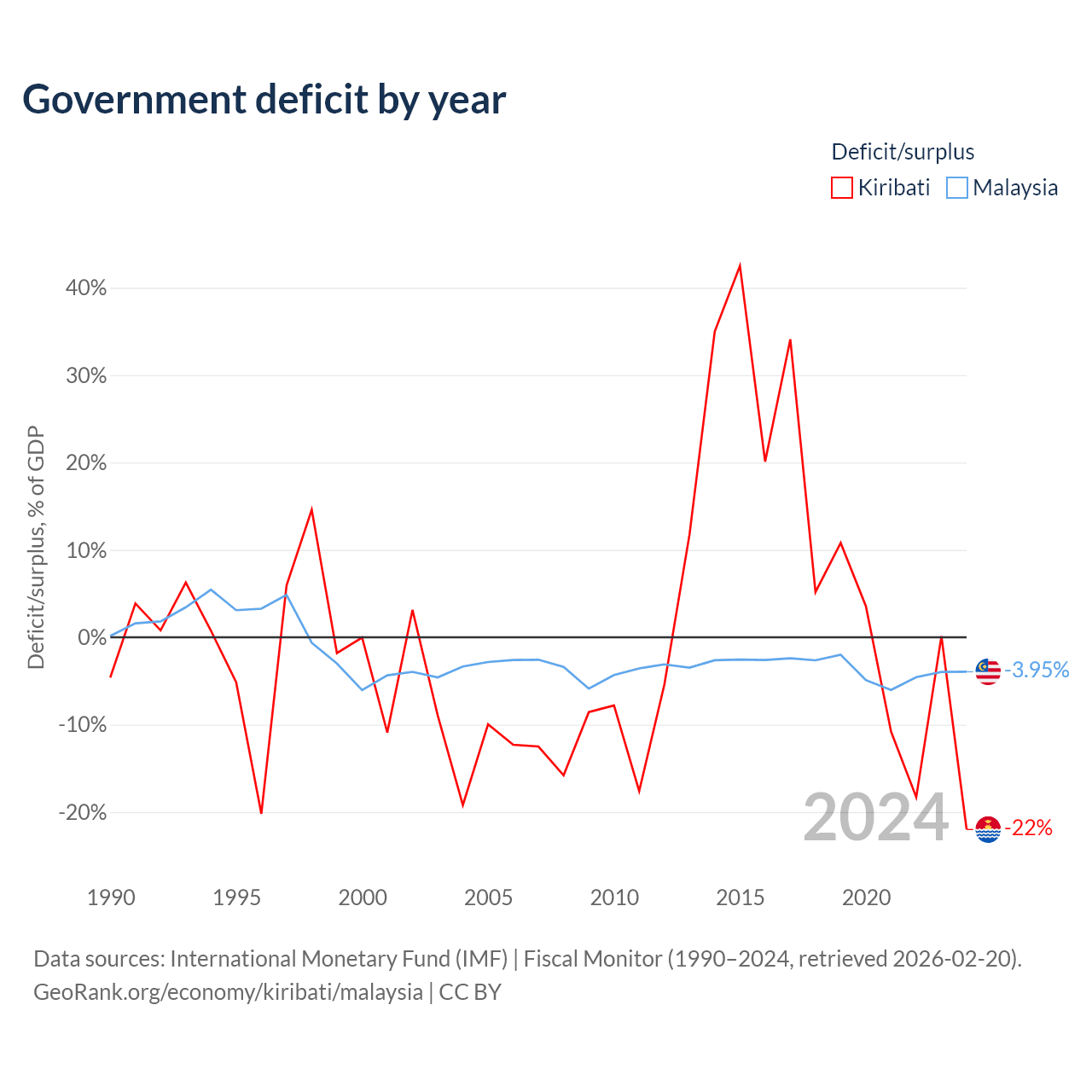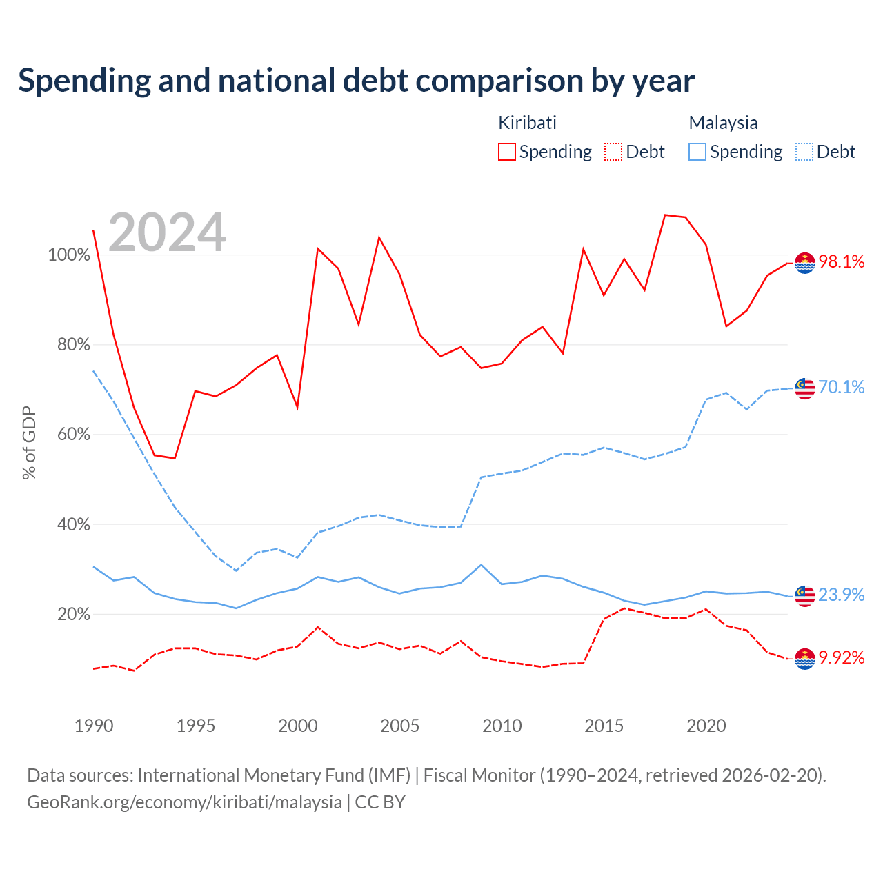 Kiribati has $30.5M in government debt (9.92% of GDP), compared to $296B (70.1% of GDP) in Malaysia.