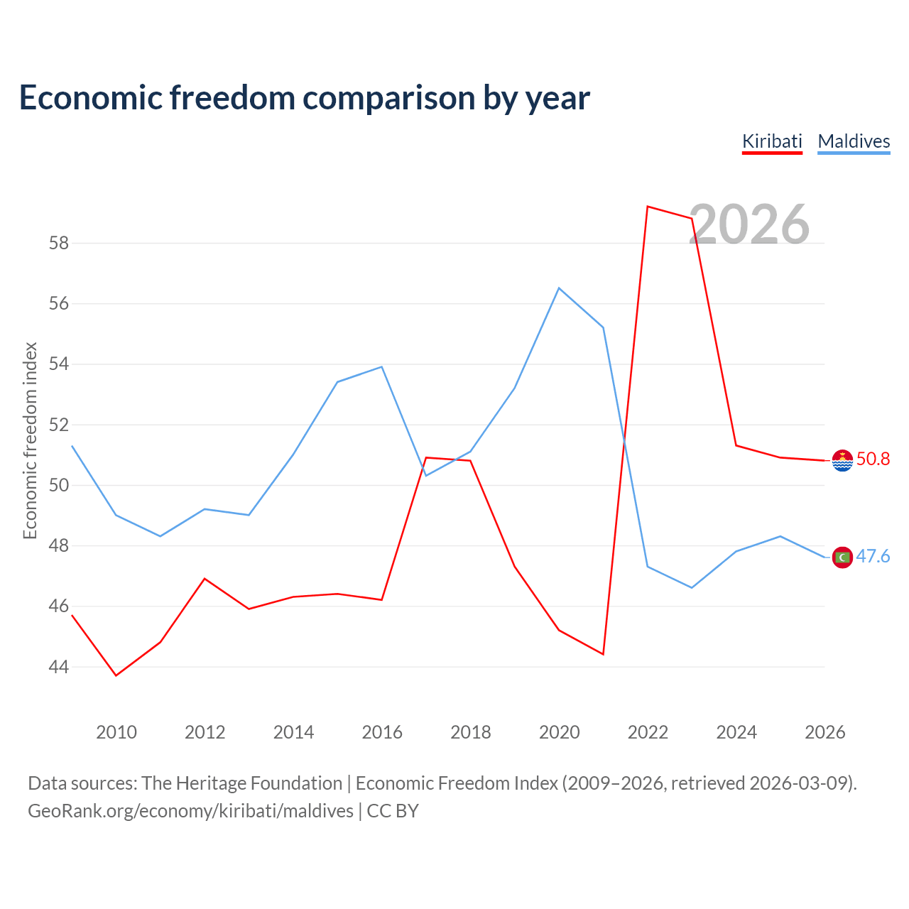 The Economic Freedom Index for Kiribati is 50.8, ranking 158/197, compared to 47.6 for Maldives, ranking 174/197. The chart above displays a comparison of annual changes in economic freedom indexes.