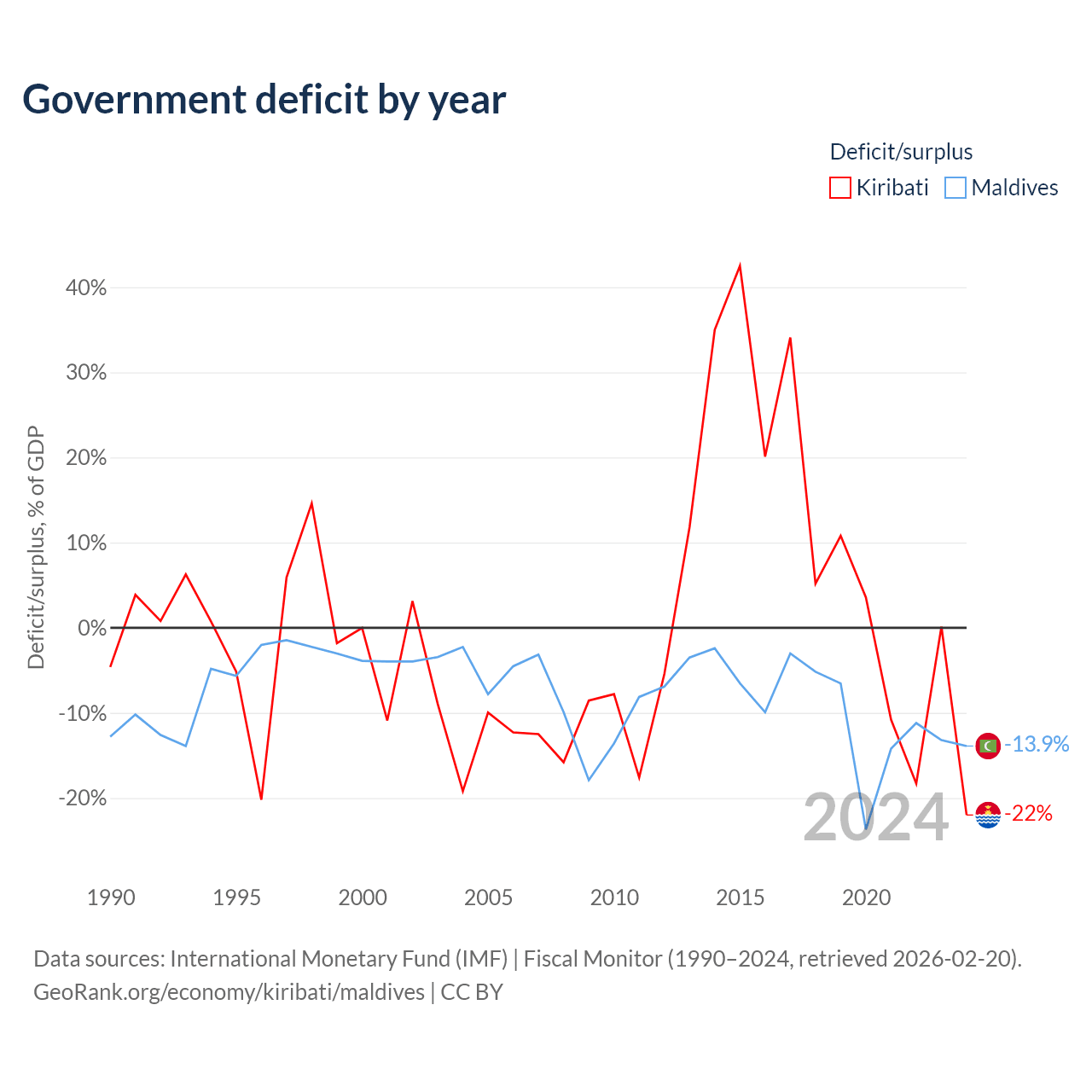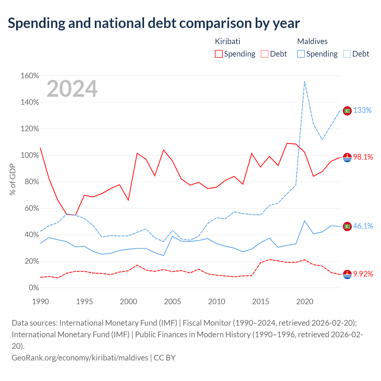 Kiribati has $30.5M in government debt (9.92% of GDP), compared to $9.41B (133.3% of GDP) in Maldives.