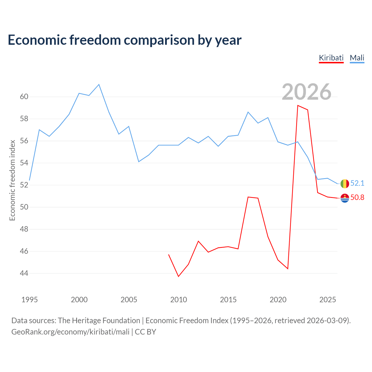 The Economic Freedom Index for Kiribati is 50.8, ranking 158/197, compared to 52.1 for Mali, ranking 150/197. The chart above displays a comparison of annual changes in economic freedom indexes.