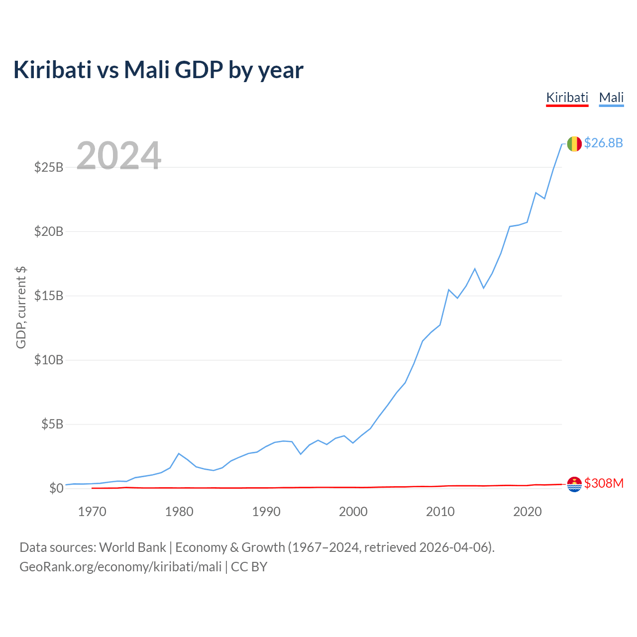 Kiribati has a GDP of $308M compared to $26.8B for Mali, ranking 192/197 and 113/197 by economy size, respectively.