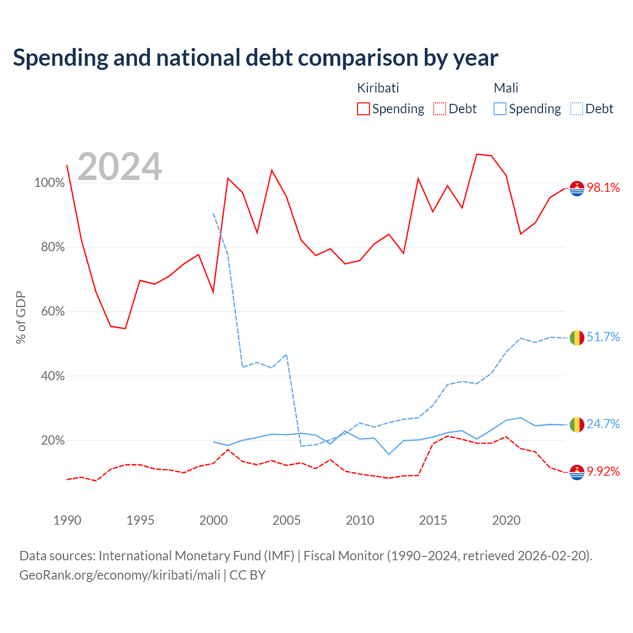 Kiribati has $30.5M in government debt (9.92% of GDP), compared to $13.9B (51.7% of GDP) in Mali.