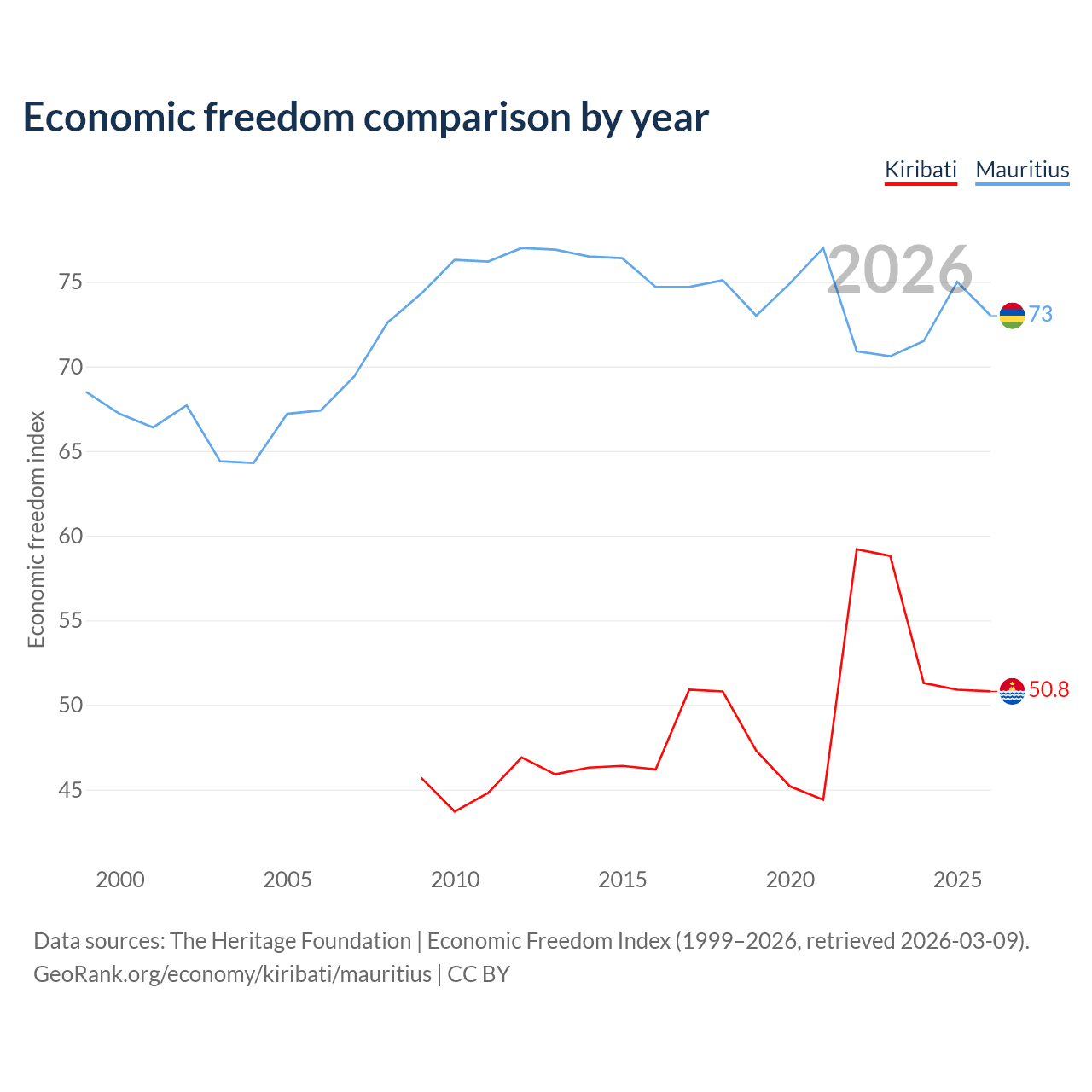 The Economic Freedom Index for Kiribati is 50.8, ranking 158/197, compared to 73 for Mauritius, ranking 26/197. The chart above displays a comparison of annual changes in economic freedom indexes.