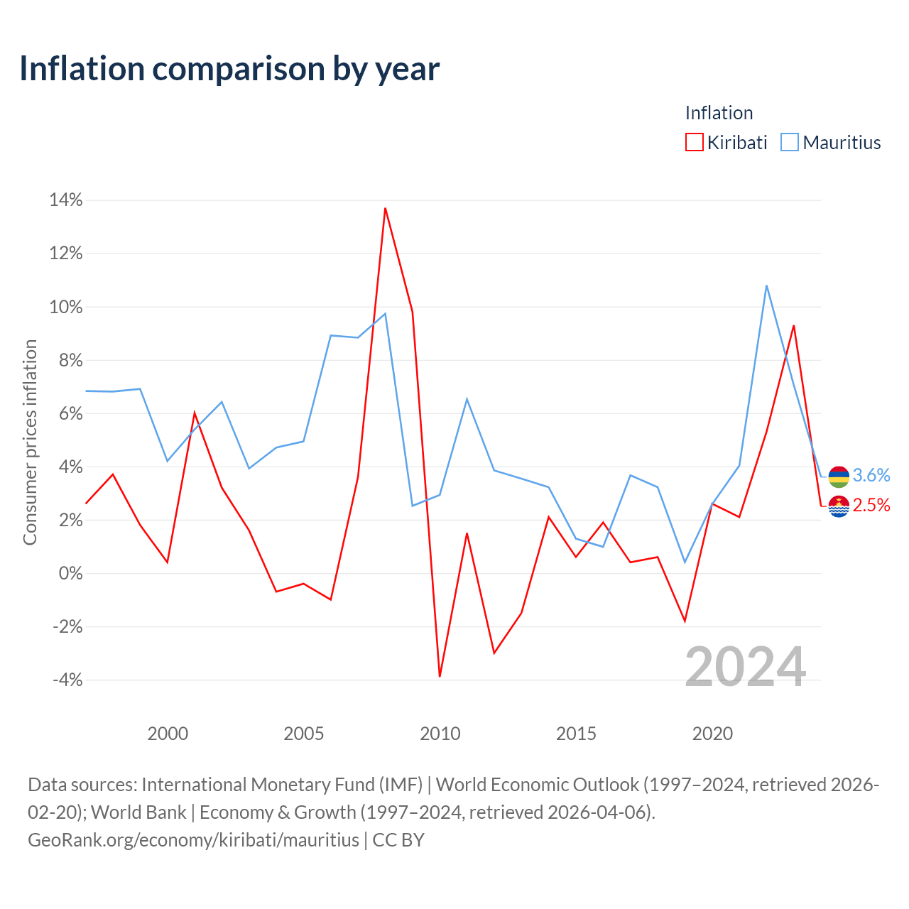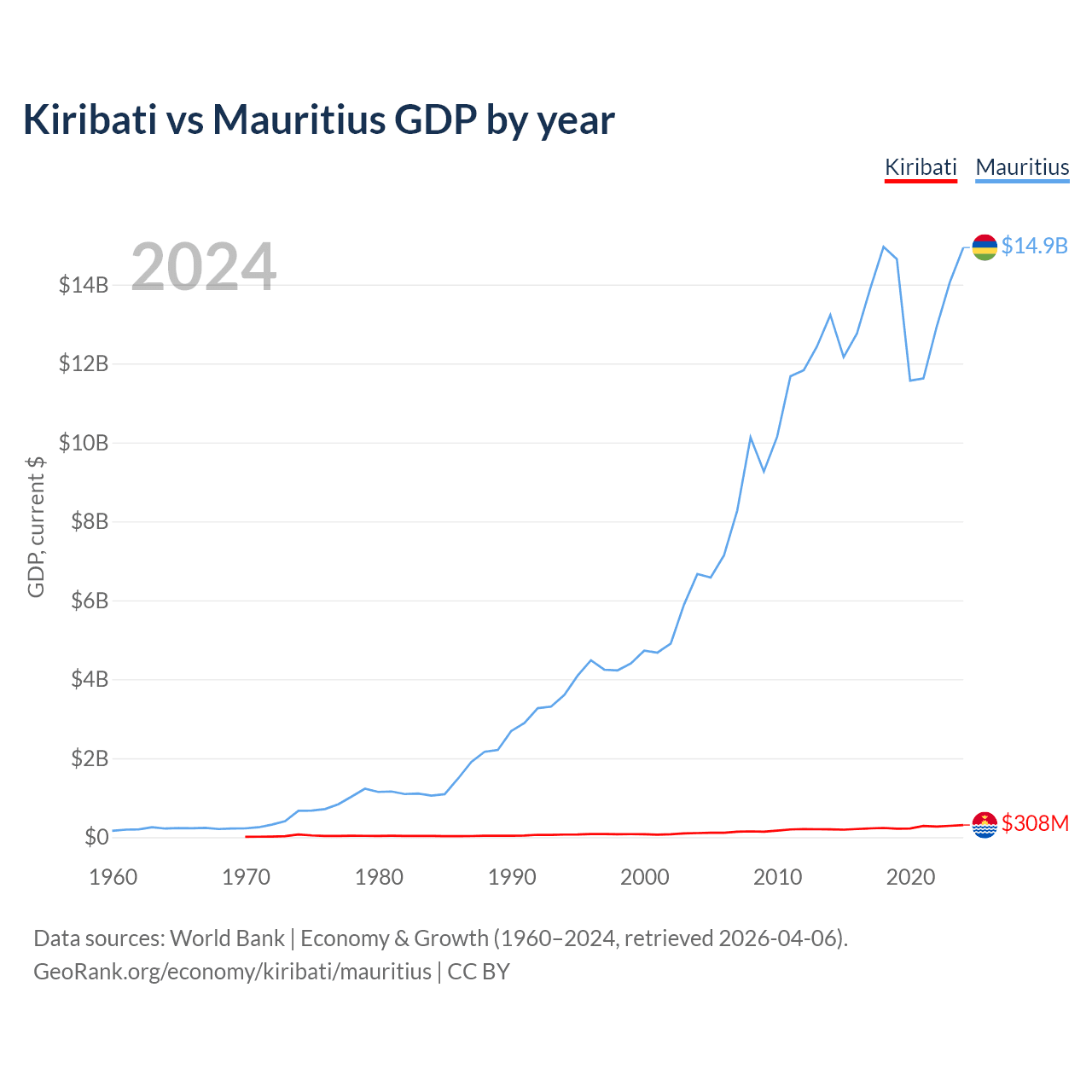 Kiribati has a GDP of $308M compared to $14.9B for Mauritius, ranking 192/197 and 143/197 by economy size, respectively.
