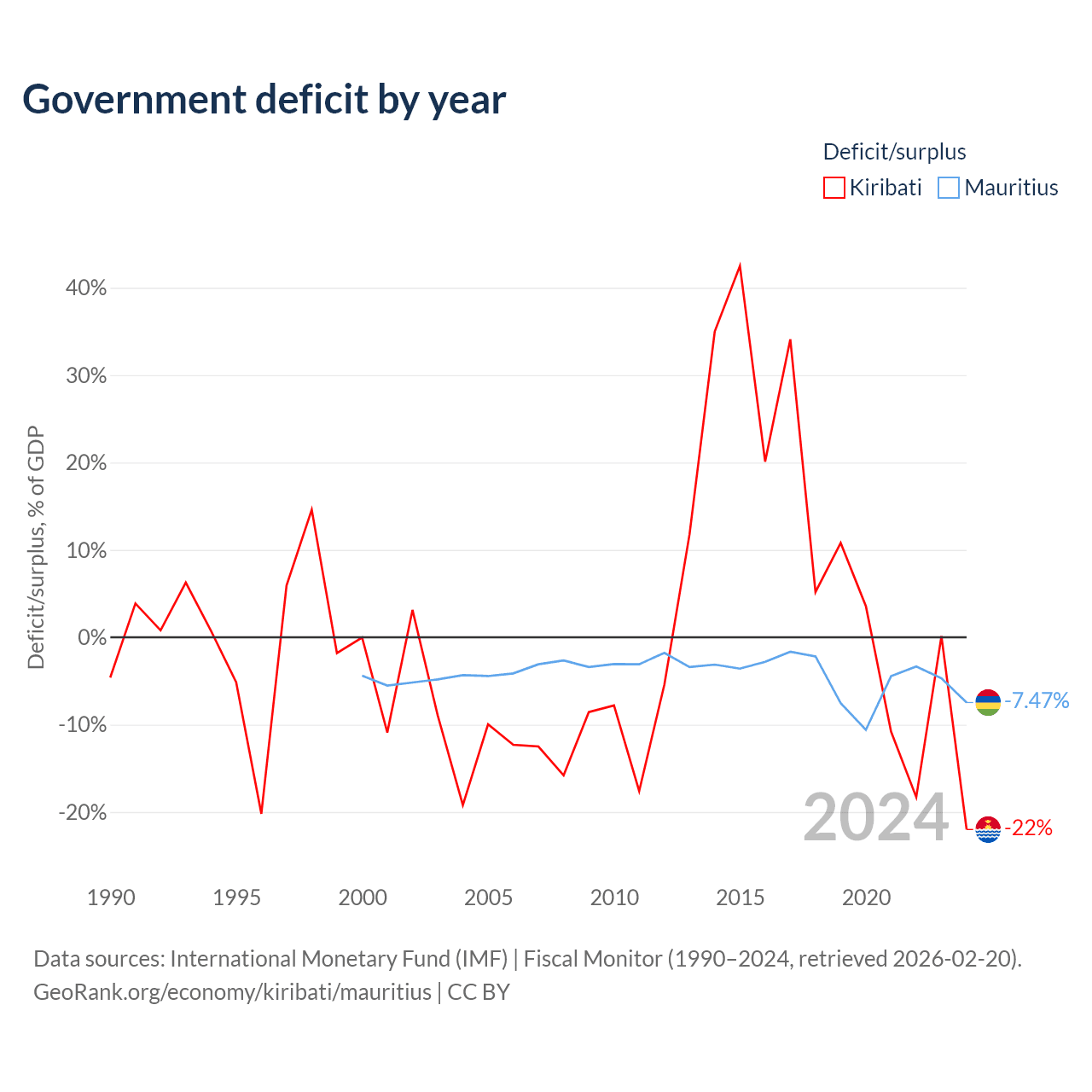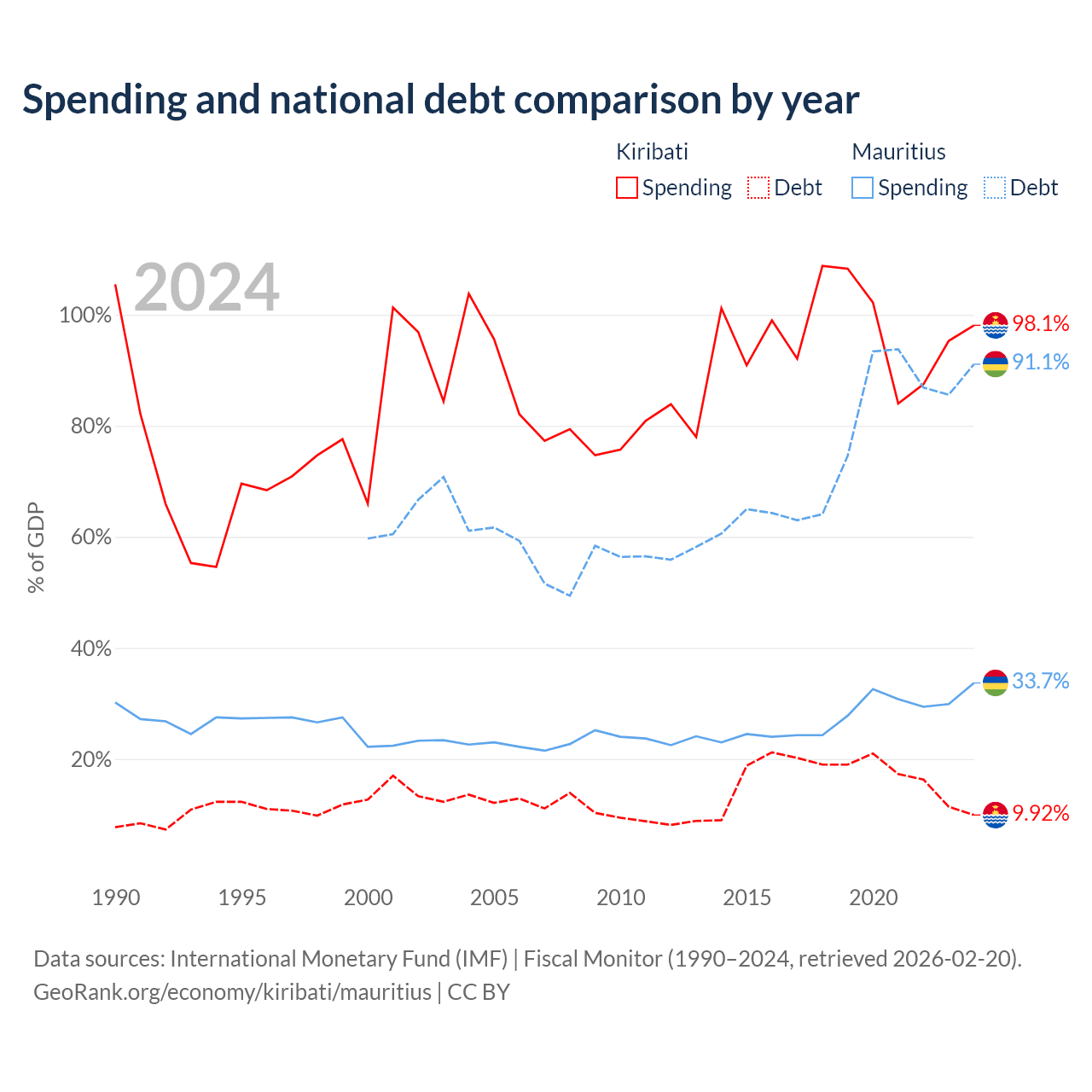 Kiribati has $30.5M in government debt (9.92% of GDP), compared to $13.6B (91.1% of GDP) in Mauritius.